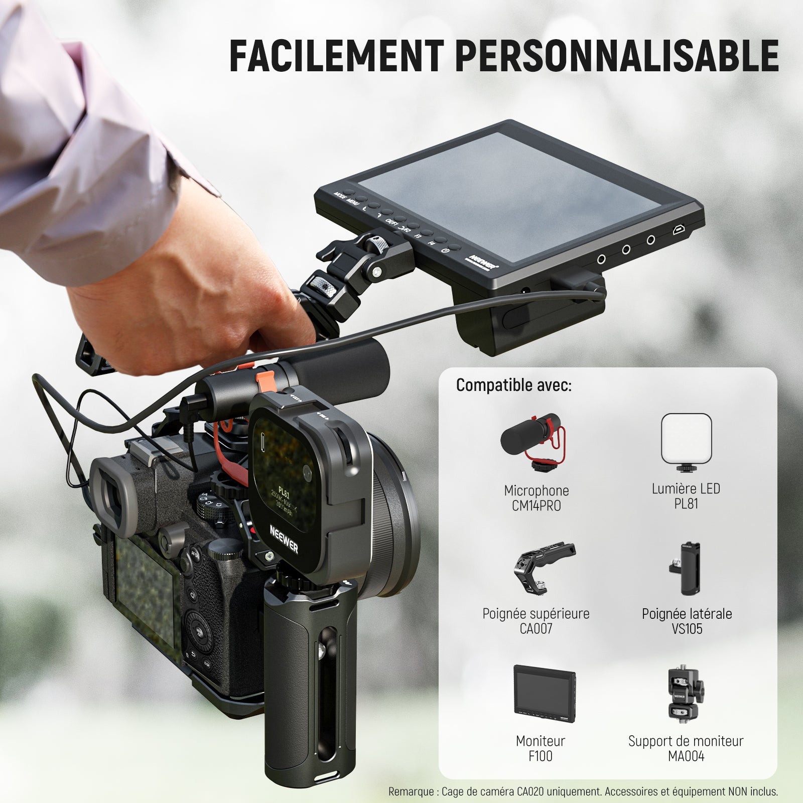 - 【Diverses options de montage】 Plusieurs filetages 1/4" et trous de positionnement ARRI 3/8", deux supports de sabots froids intégrés et un rail OTAN latéral intégré pour le microphone (CM14 PRO), le moniteur de terrain (F100), la lumière LED (PL81 ), le mini follow focus (PG001), la poignée supérieure (CA007), le bras magique, etc. Une fente pour dragonne supplémentaire pour votre commodité