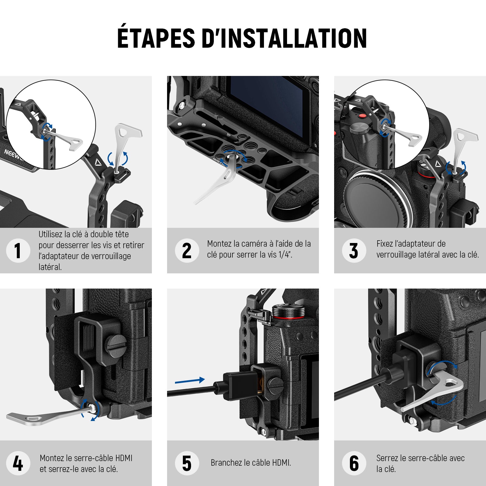 - 【Triple verrous anti-torsion】 Doté d'un triple système de verrouillage, votre caméra sera solidement fixée à l'aide de la vis de positionnement inférieure de 1/4" et de deux adaptateurs de verrouillage latéraux. Une clé à double tête incluse est stockée magnétiquement sous la cage pour serrer les vis sans supplément outils sans effort