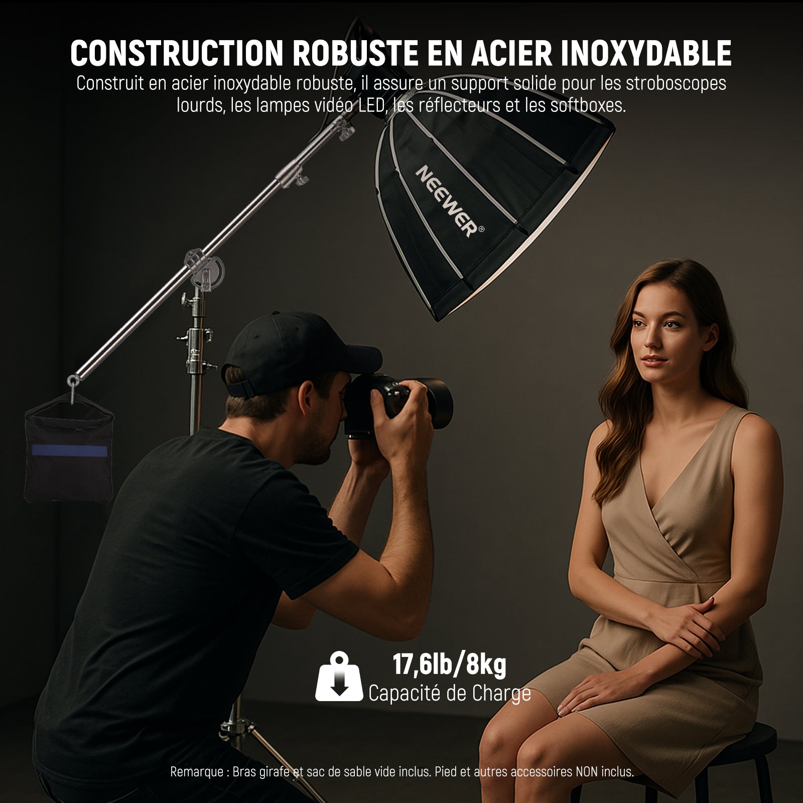 - 【Construction en acier inoxydable robuste】 Construit en acier inoxydable sélectionné avec des diamètres épaissis de 25 mm et 30 mm (conception en 2 sections), le bras de support d'éclairage NEEWER DS021 avec une structure substantielle bénéficie d'une capacité de charge impressionnante allant jusqu'à 17,6 lb/8 kg, assurant un support robuste pour les stroboscopes lourds, les lumières vidéo LED, les réflecteurs ou les softbox
