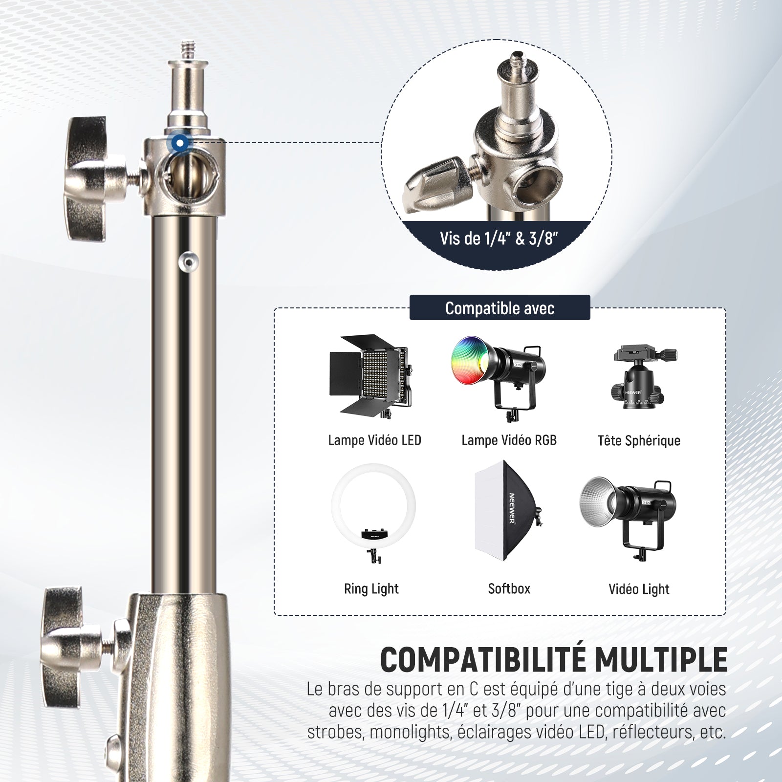 - 【Compatibilité polyvalente】 Le point de montage universel assure une fixation transparente à la colonne centrale d'un support en C, d'un support d'éclairage à roulettes ou d'autres supports d'éclairage ordinaires, facilement fixé avec le bouton. De plus, le bras du support en C est équipé d'un goujon bidirectionnel avec des vis de 1/4" et 3/8" pour la compatibilité avec les stroboscopes, les monolights, les lampes vidéo LED, les réflecteurs, etc.
