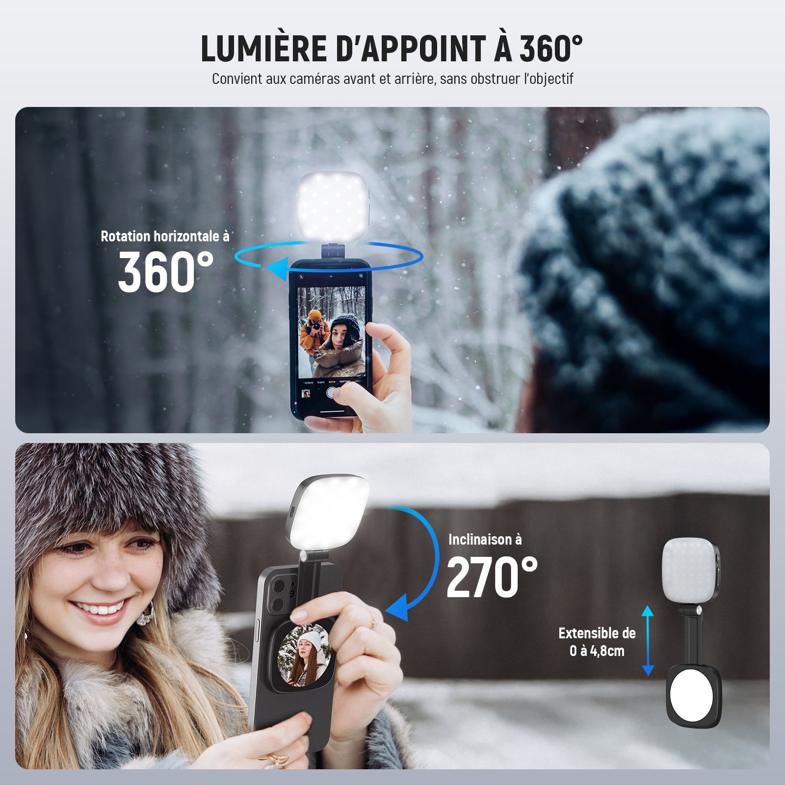 - 【Lampe vidéo magnétique à selfie à 360°】 La mini lumière vidéo comme accessoire de photographie est compatible avec MagSafe iPhone 16 Pro Max Plus 15/14/13/12 iPad Pro et d'autres appareils magnétiques. Pour les appareils non magnétiques, utilisez l'anneau magnétique autocollant fourni pour le fixer à un téléphone Android pour des enregistrements en tête ou un ordinateur portable de table pour les appels vidéo, compatible avec Samsung Galaxy S25 S24 S23 Ultra, etc. Prend en charge la rotation horizontale à 360° et l'inclinaison verticale de 270°