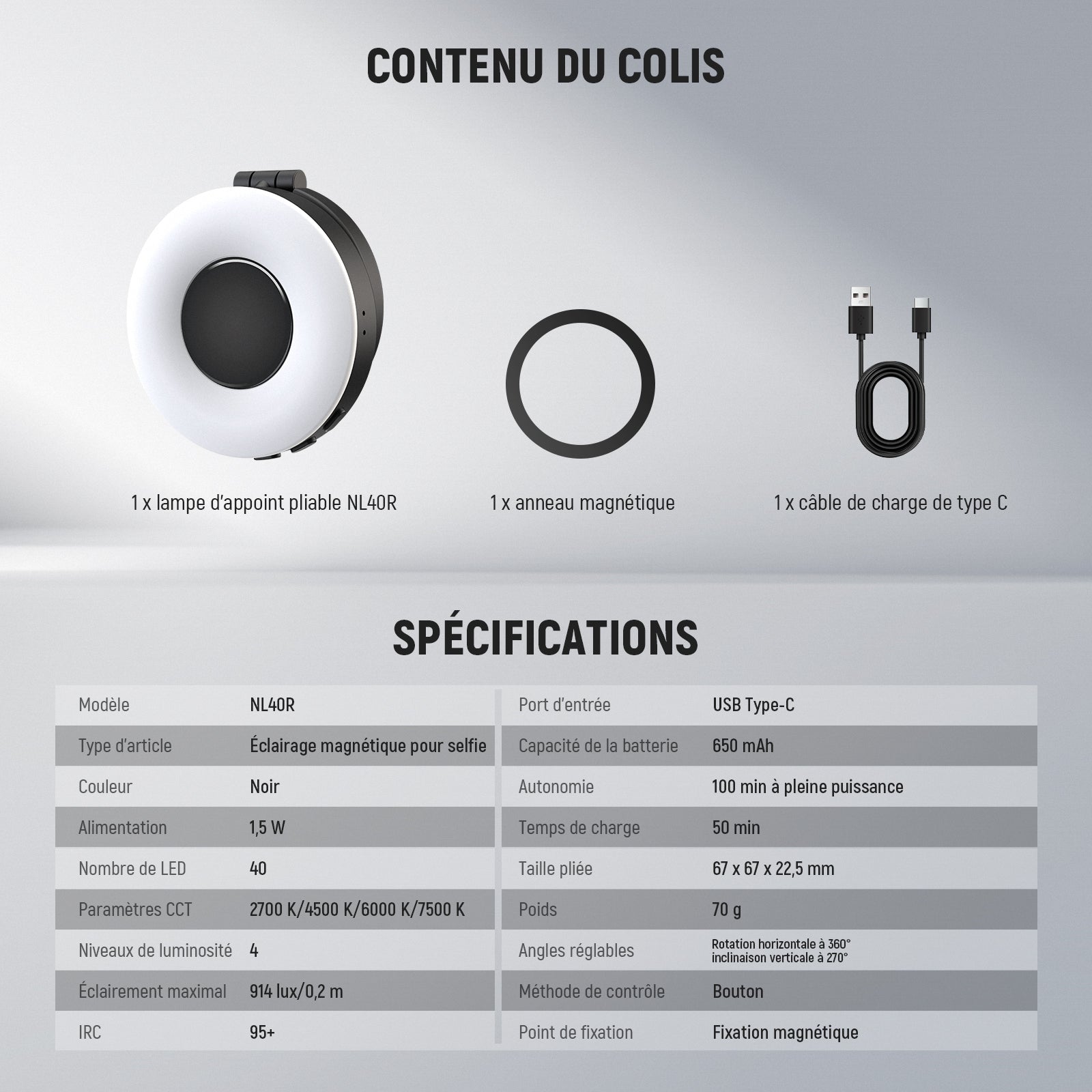 - 【Mini anneau lumineux portable pour téléphone portable】la lampe LED NL40R pour la photographie et les appels vidéo est compacte avec 67 x 67 x 22,5 mm une fois pliée et ne pèse que 70 g. Il se glisse facilement dans une poche, ce qui en fait un accessoire idéal pour les prises de vue en déplacement. Il dispose de 40 LED chaudes et froides de haute qualité qui offrent un éclairage de 914 lux/0,2 avec un IRC élevé de 95+, idéal comme lampe à selfie pour téléphone portable pour améliorer votre teint