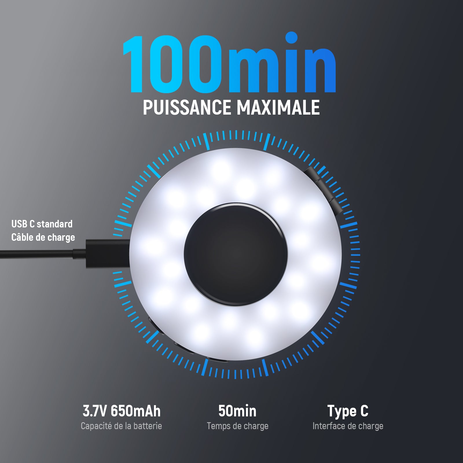 - 【Rechargeable par USB C avec une autonomie de 100 minutes】la batterie intégrée de 650 mAh permet à la petite lampe LED pour les photos de téléphone portable de fonctionner jusqu'à 100 minutes à 100 % de luminosité. Une charge complète ne prend que 50 minutes à travers un chargeur portable ou un appareil portable avec le câble USB de type C fourni. Un anneau lumineux portable avec une longue durée de vie de la batterie, parfait pour les selfies prolongés, les enregistrements vidéo, les enregistrements de films, la vidéo de voyage et la photographie en déplacement