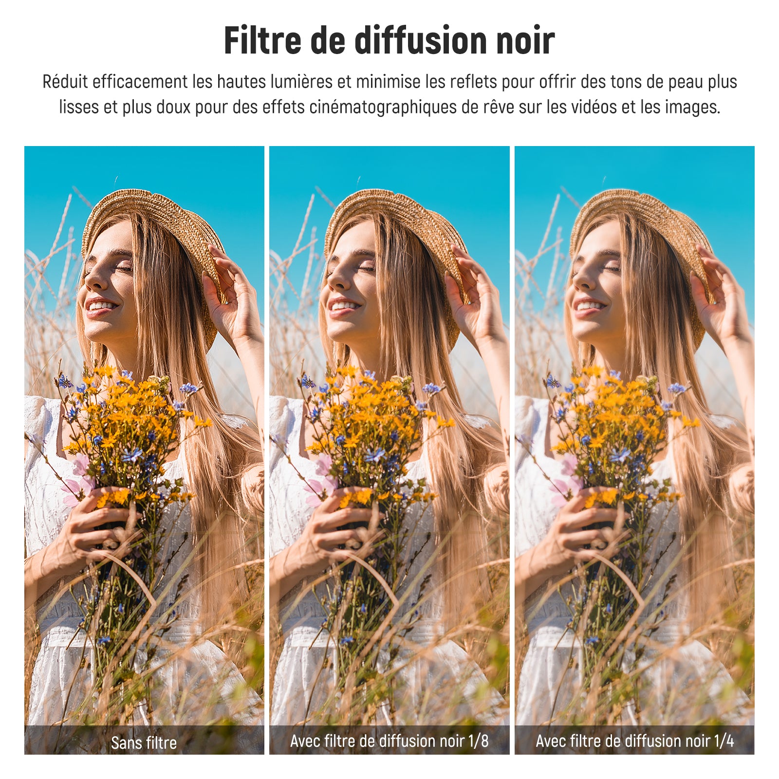 - Ambiance cinématographique douce et rêveuse : le filtre de diffusion noir 1/4 et 1/8 peut lisser la texture de la peau tout en ajoutant un effet de rêve et de flou à vos prises de vue. Parfait pour la photographie de portrait, les selfies, les scènes pleines d'action et les vlogs personnels. Indispensable pour les appareils photo des créateurs de contenu/influenceurs