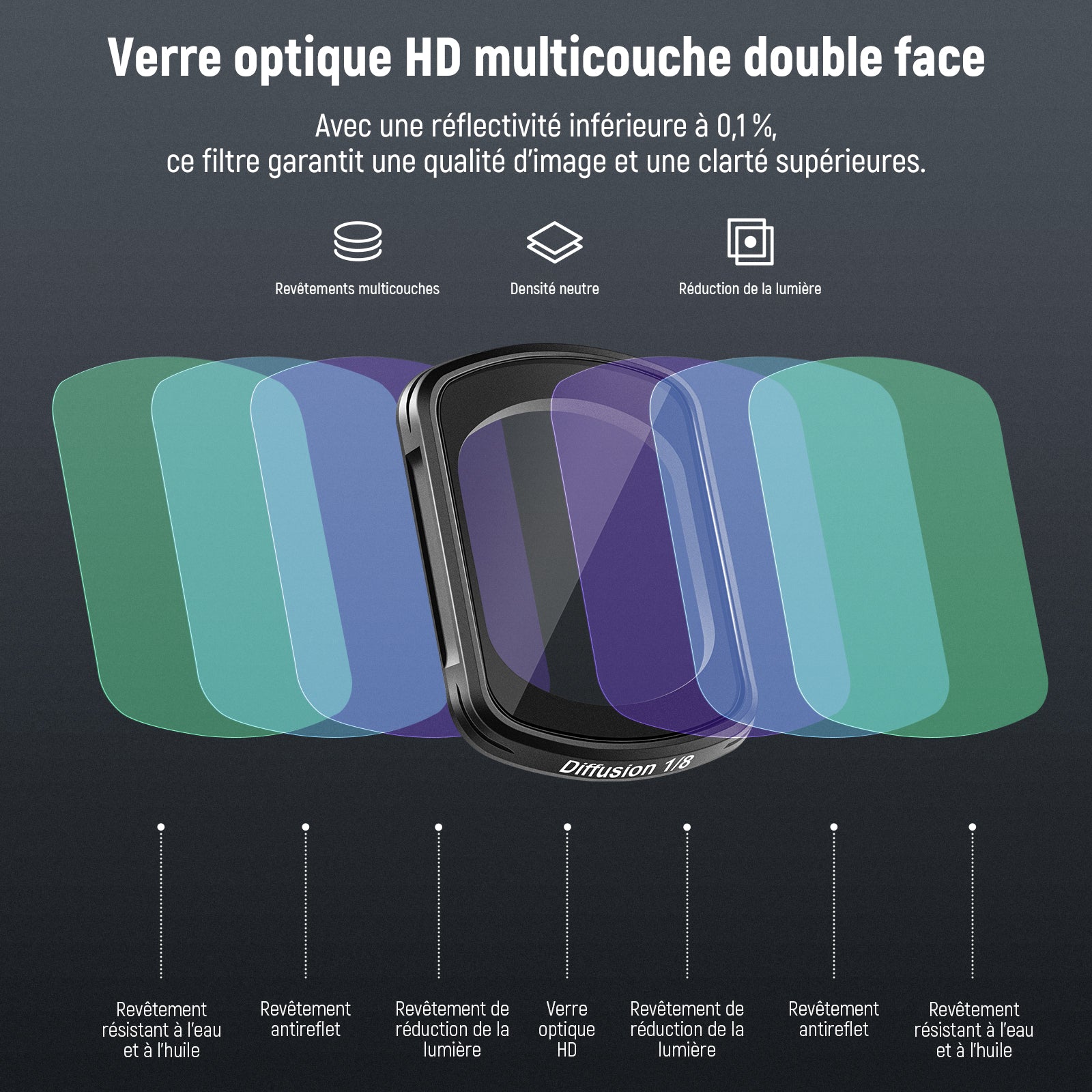 - Verre optique HD multicouche : avec 30 couches de revêtements sur les deux côtés du verre optique HD, ce filtre de caméra d'action portable est résistant à l'eau, aux rayures et à l'huile, assurant une qualité optique durable dans les environnements difficiles