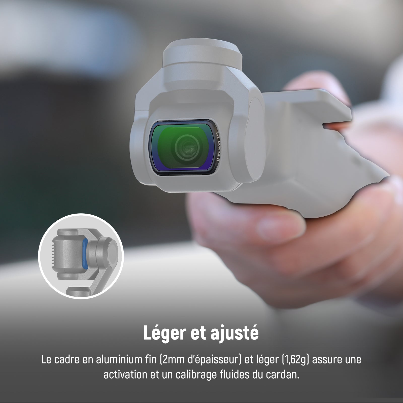 - Construction fine et légère : avec des cadres robustes et ultra fins, les filtres n'affecteront pas le rangement du cardan. Remarque : ne pas appliquer de protecteurs d'objectifs, car ils peuvent réduire la force magnétique, provoquer une aberration chromatique et interférer avec le stockage du cardan