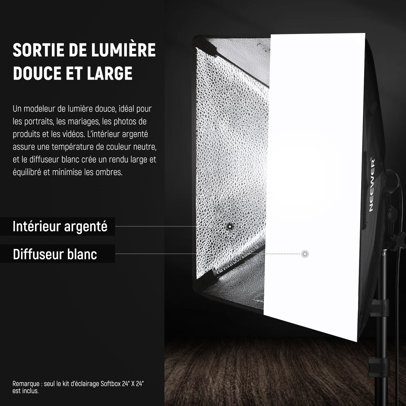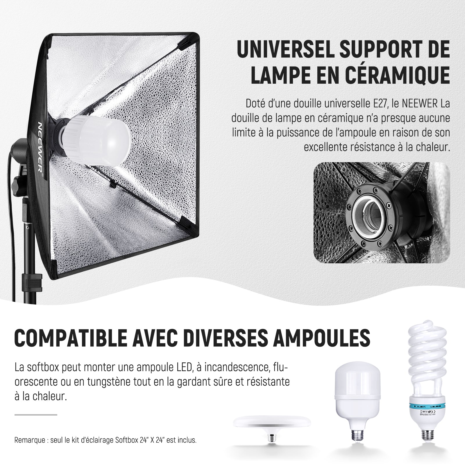 - Softbox 24"X24"/60x60cm : Softbox diffuse la lumière et vous offre un éclairage parfait et uniforme lorsque vous en avez besoin pour les meilleures prises de vue possibles. Avec la douille E26, vous pouvez connecter directement des ampoules, des lampes fluorescentes ou des flashs esclaves