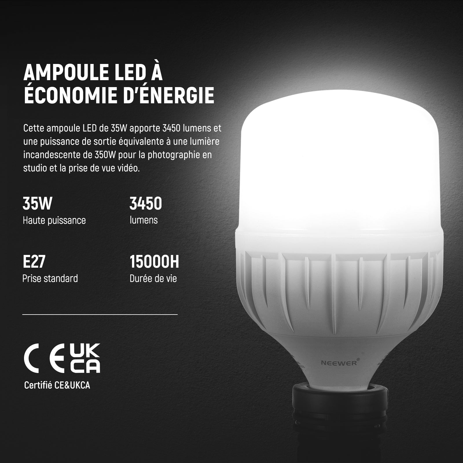 - Ampoule LED 35W 5 700K : cette ampoule LED 35W a une puissance de sortie équivalente à une lumière à incandescence de 350W et apporte 3 150 lumens pour la photographie en studio et la prise de vue vidéo. Vissez-le dans une douille E26 standard pour un éclairage lumineux et constant sans scintillement