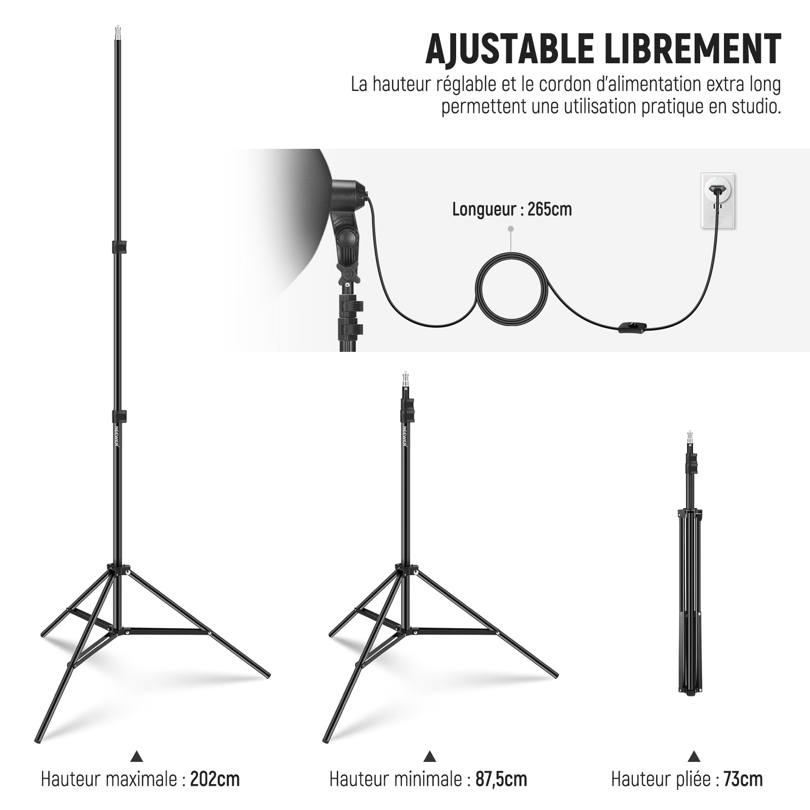 - Support d'éclairage 83"/210cm : Construit en alliage d'aluminium, ce qui lui confère une résistance exceptionnelle pour les travaux lourds. Grâce à des verrous rapides à simple action, le support permet un réglage rapide et précis de la hauteur. Comprend un sac de transport pour transporter et protéger facilement l'équipement