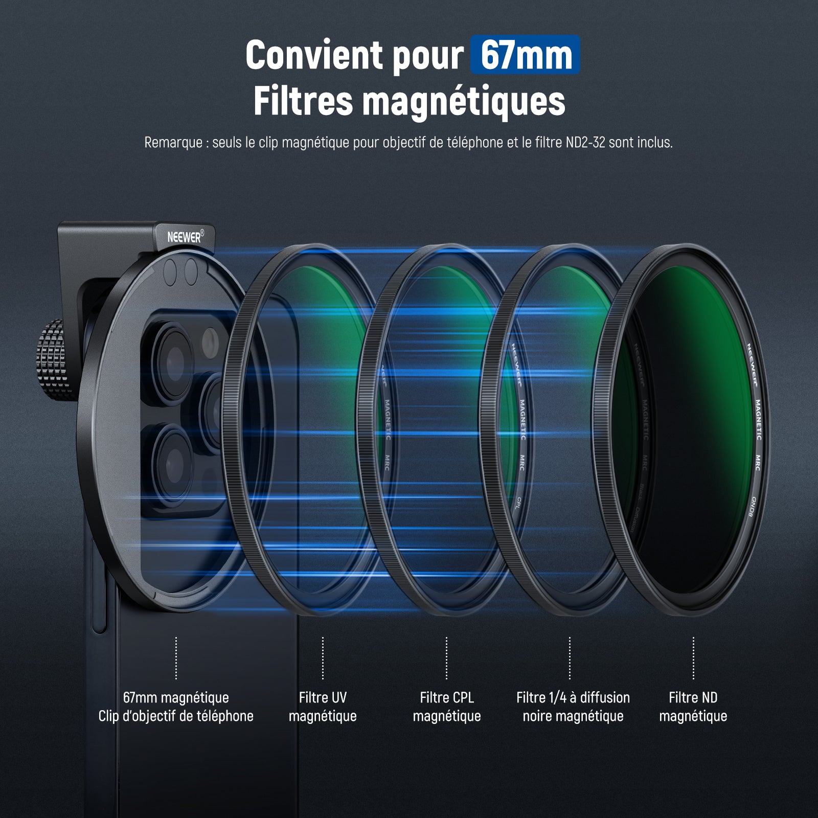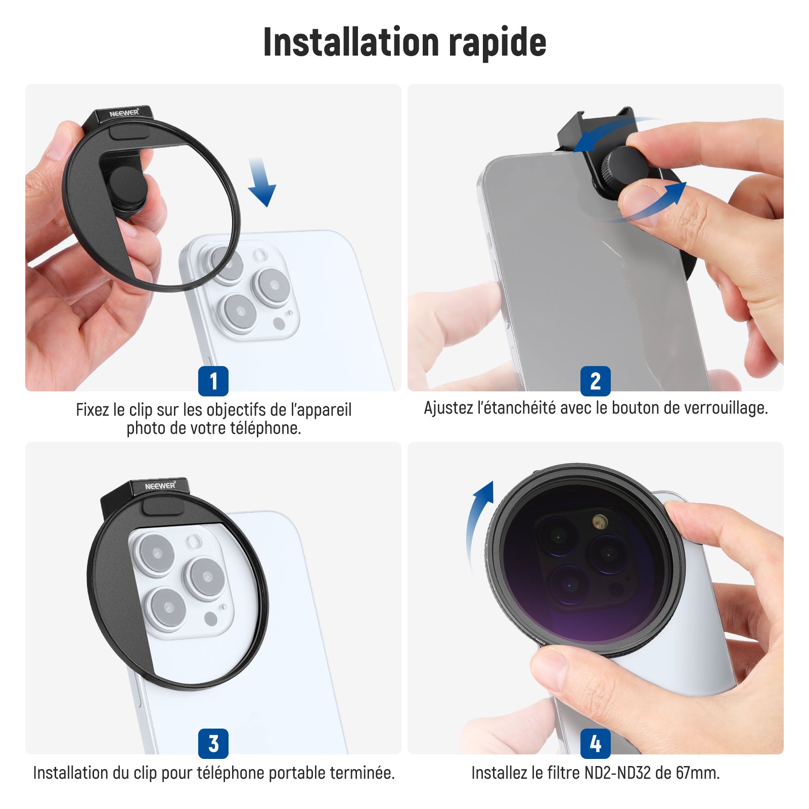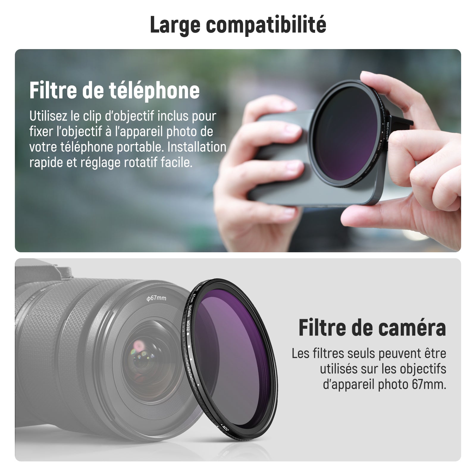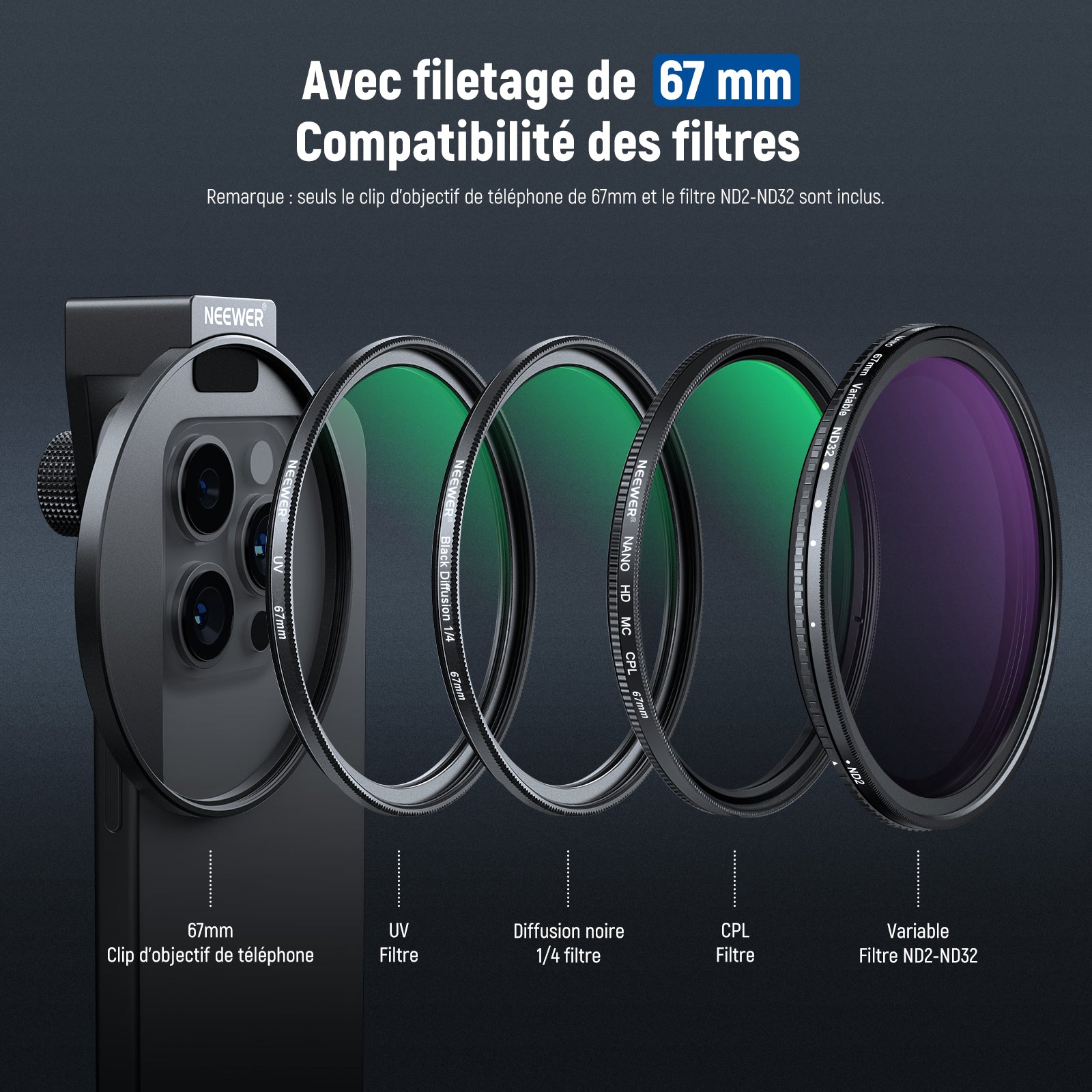 - 【Solution de prise de vue polyvalente pour téléphone】 le kit de filtre ND variable Neewer de 67 mm pour objectif de téléphone est votre compagnon de confiance pour améliorer votre photographie mobile avec un anneau adaptateur de filtre fileté universel et un contrôle précis de réduction de la lumière. Compatible avec iPhone 16 15 14 13 Pro Max, Samsung Galaxy S22, S23, S24 Ultra, et d'autres téléphones jusqu'à 13 mm d'épaisseur (retrait de la coque recommandé).