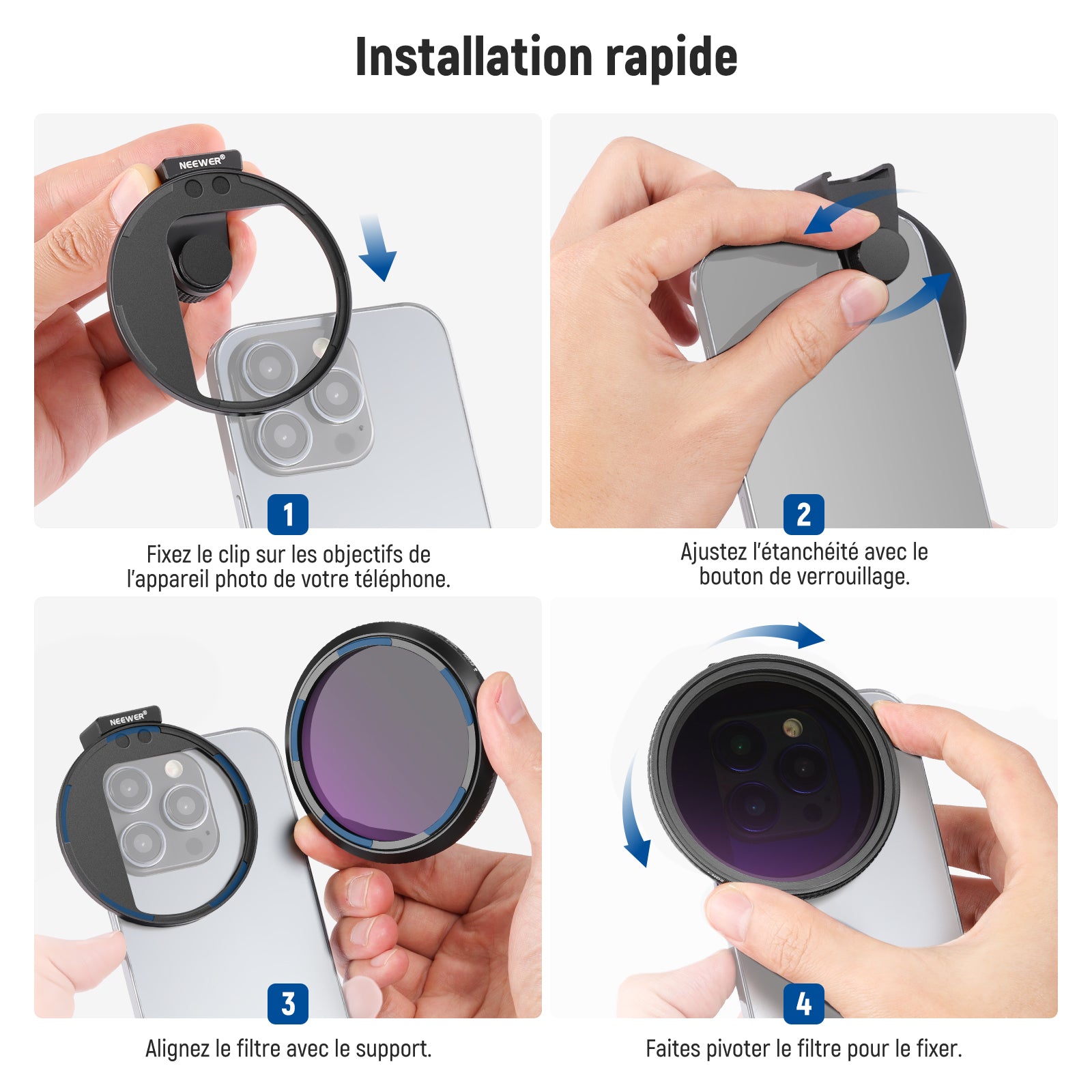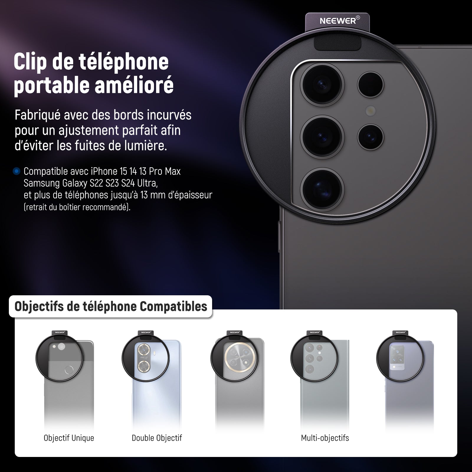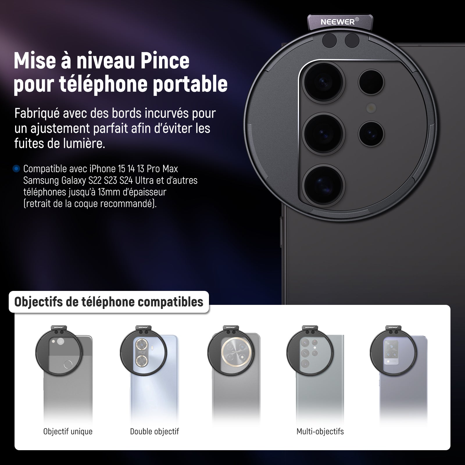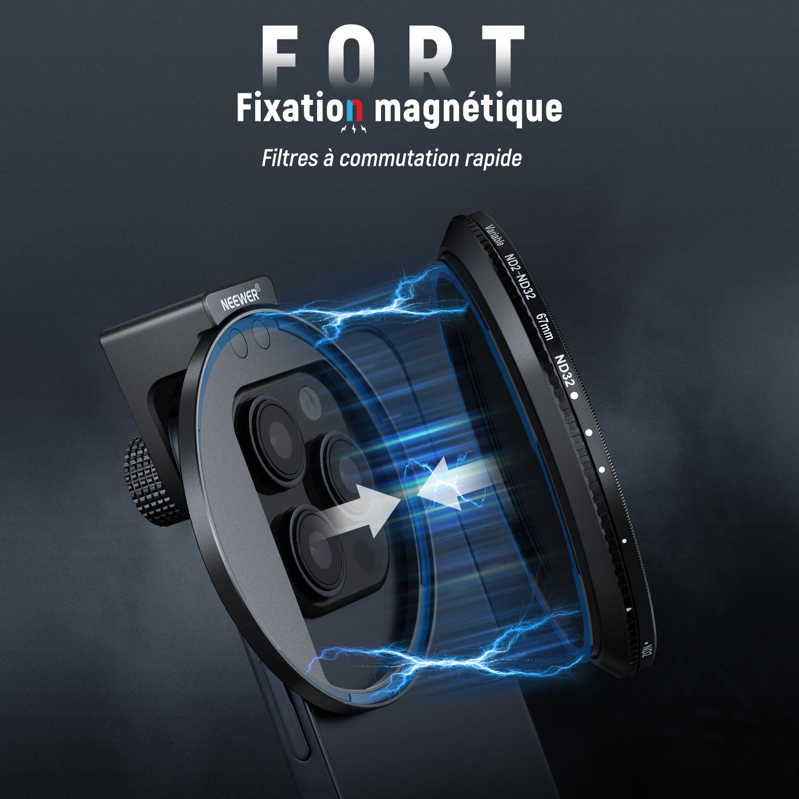 - 【Solution de prise de vue polyvalente pour téléphone】 le kit de filtre ND variable Neewer de 67 mm pour objectif de téléphone est votre compagnon de confiance pour améliorer votre photographie mobile avec un anneau adaptateur de filtre fileté universel et un contrôle précis de réduction de la lumière. Compatible avec iPhone 16 15 14 13 Pro Max, Samsung Galaxy S22, S23, S24 Ultra, et d'autres téléphones jusqu'à 13 mm d'épaisseur (retrait de la coque recommandé).