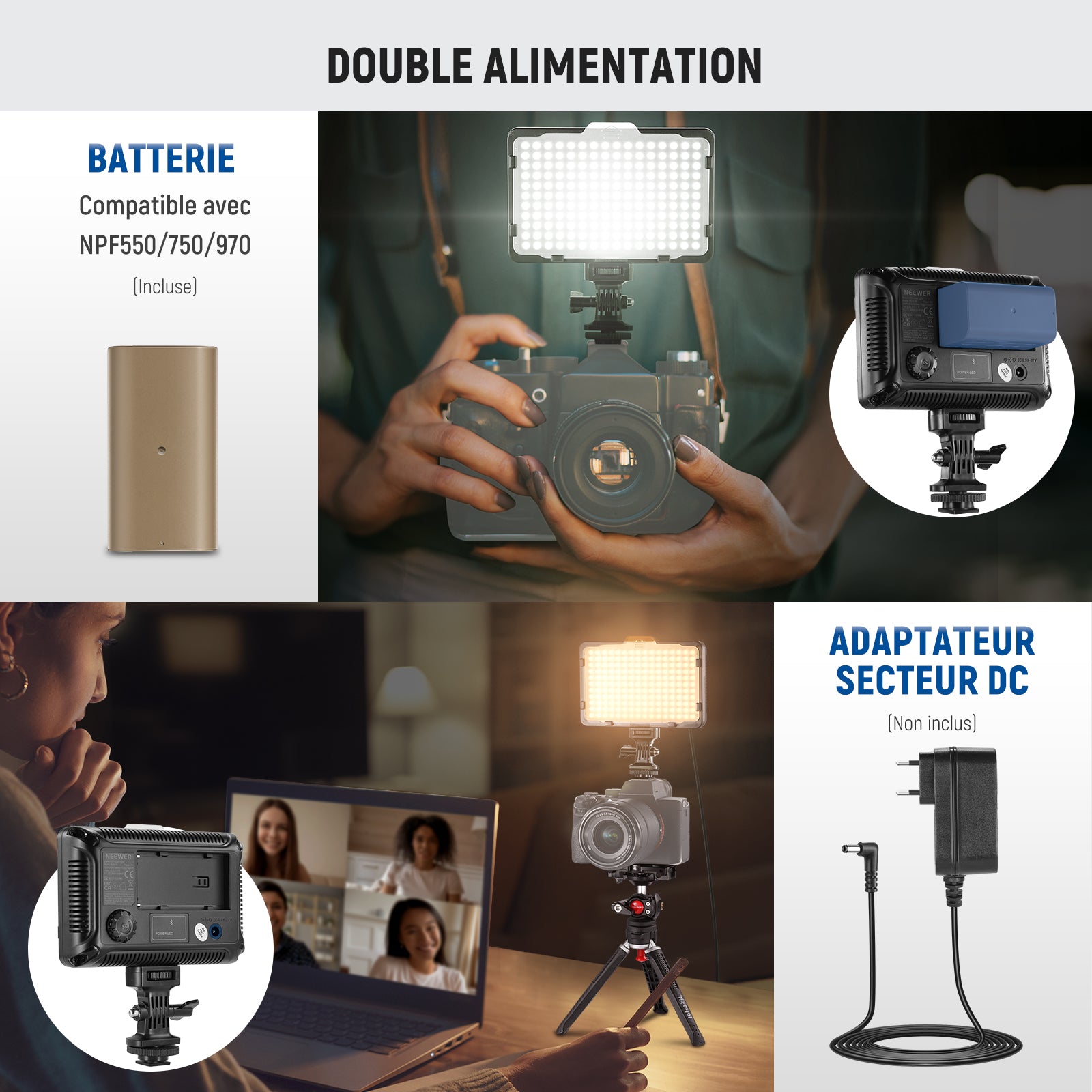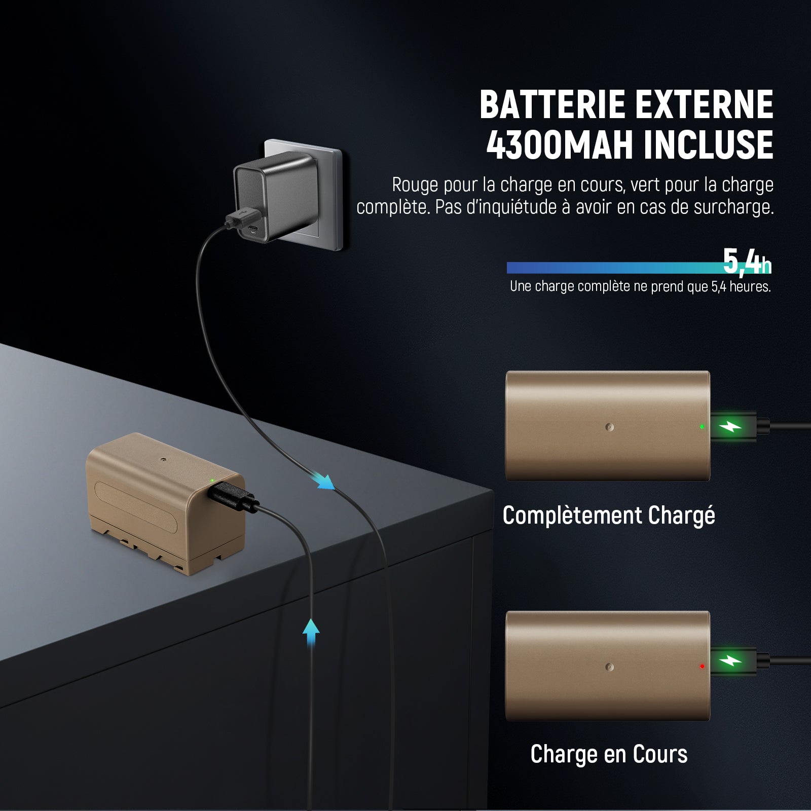 - 【Batterie externe 4300mAh incluse】Ce kit d'éclairage pour la photographie et la vidéographie comprend une batterie de rechange NP-F grande capacité de 4300mAh, une alimentation de secours robuste et portable pour des séances de prise de vue ininterrompues sur de longues périodes. Idéal pour l'éclairage principal ou d'appoint pour les clips vidéo, les selfies, les portraits etc. Vous pouvez également alimenter le panneau lumineux avec une batterie Li-ion NP-F550/NP-F970 (NON incluse).