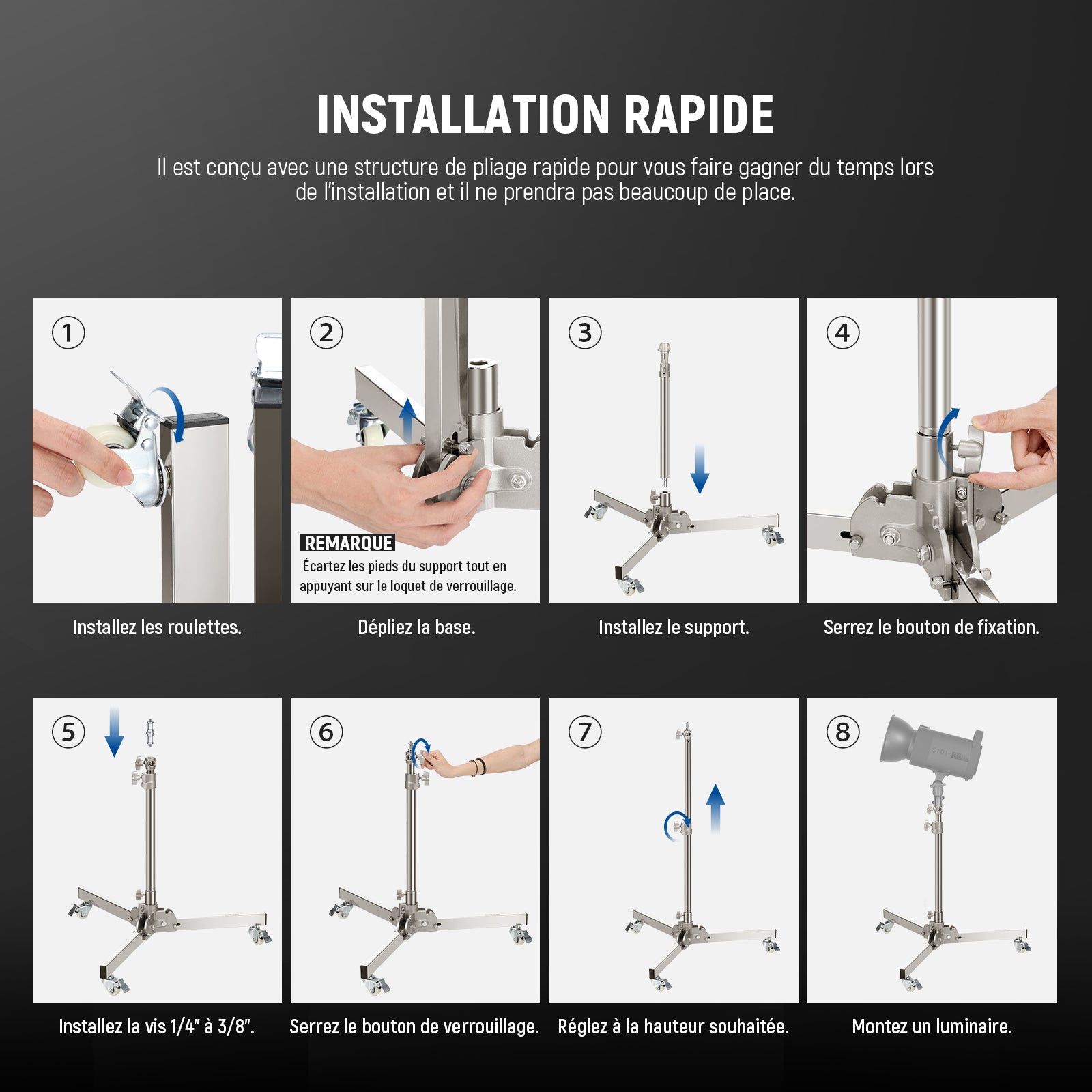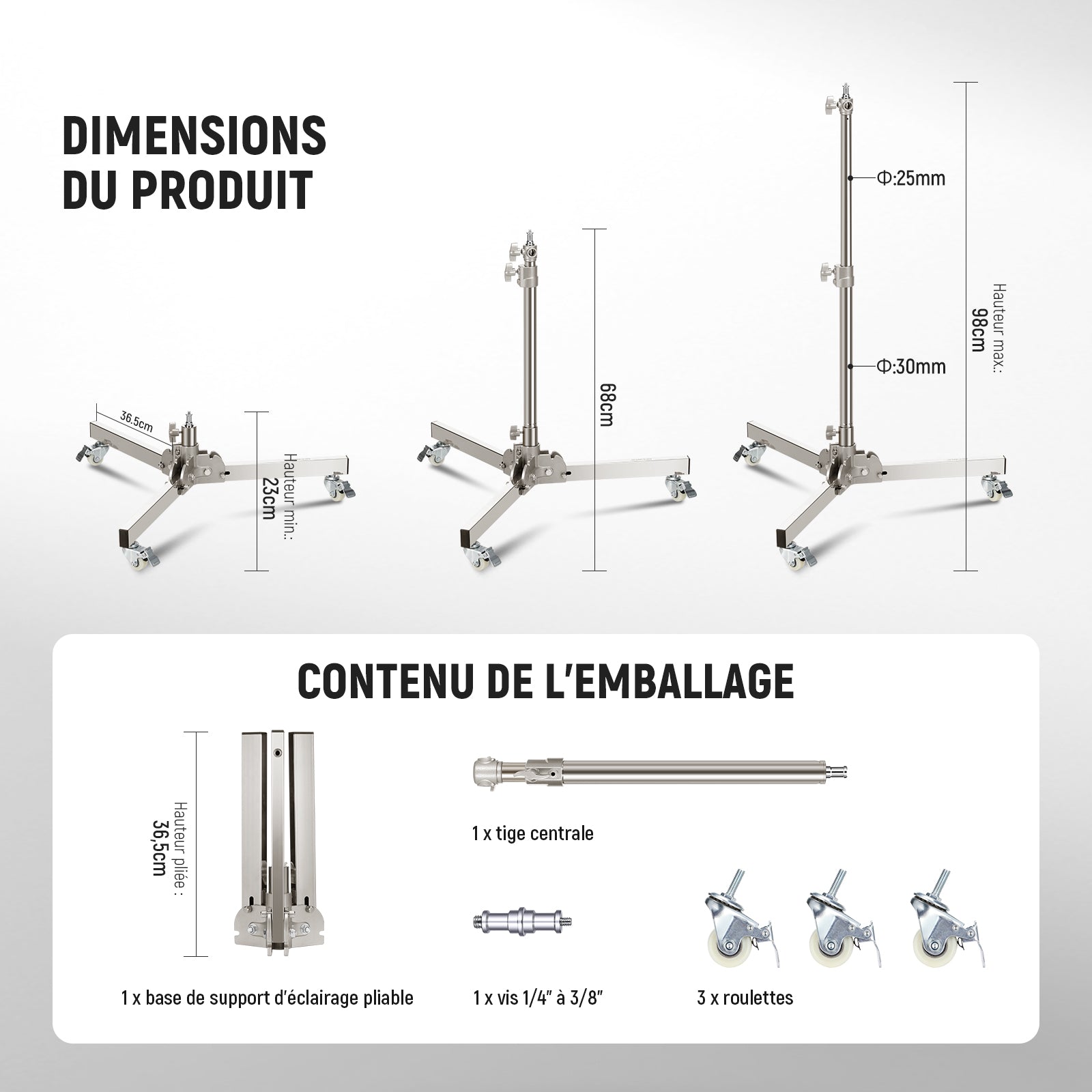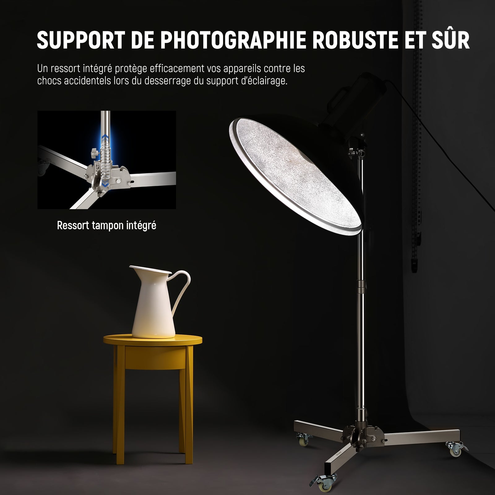 - 【Mobilité et portabilité améliorées】 équipé de trois roulettes haut de gamme, il est facile et pratique à déplacer et à positionner pour des réglages de photographie optimaux. Le support d'éclairage peut être plié dans une taille compacte avec une structure pliable rapide sur la base pour un rangement et un transport faciles, ce qui le rend plus pratique à transporter pour la photographie en extérieur