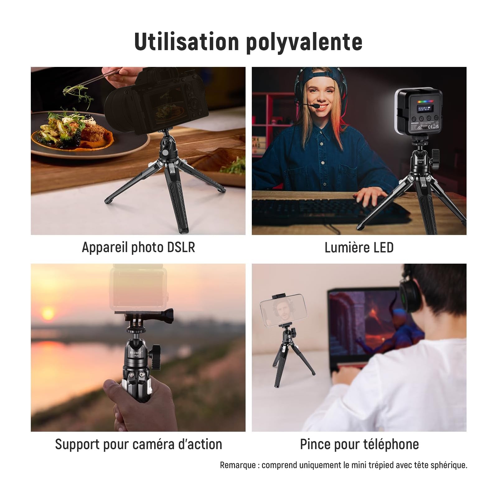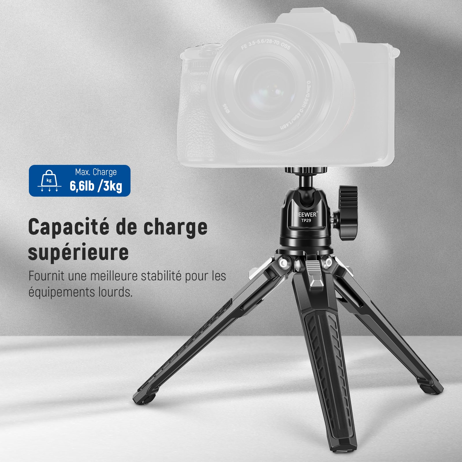 - 【Petit trépied stable supérieur】 Obtenez des séquences stables et sans secousses avec le robuste trépied de table tout en métal et la tête à bille. Il supporte une capacité de charge maximale de 6,6lb/3kg, ce qui garantit la stabilité même pour les appareils photo de grande taille. Les pieds en caoutchouc antidérapants assurent une bonne prise en main sur n'importe quelle surface pour des prises de vue stables