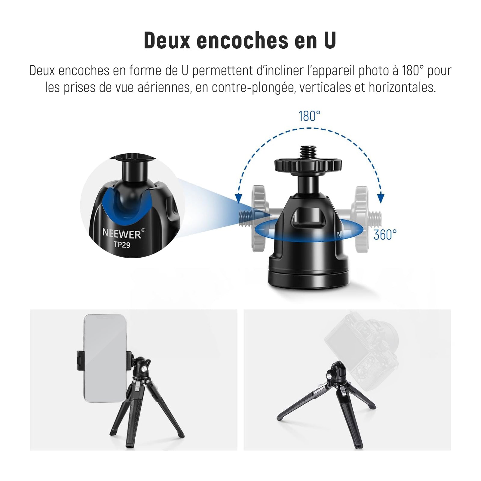 - 【Rotule à 360° pour prises de vue verticales】 La conception à double encoche en U de la rotule entièrement métallique permet une rotation horizontale à 360° et verticale à 90° de manière flexible mais stable, parfaite pour les prises de vue au-dessus de la tête, les angles bas, les prises de vue verticales et horizontales. Tournez le bouton de verrouillage pour fixer votre appareil à tous les angles souhaités
