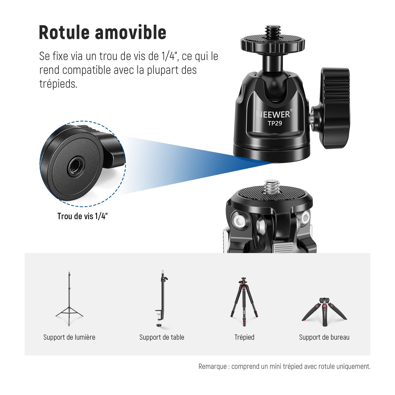- 【Compatibilité plus large】 La tête de trépied avec une vis universelle 1/4" qui peut être connectée aux appareils photo reflex numériques, caméscopes, supports de téléphone, lampes vidéo et microphones, même compatible avec les adaptateurs de caméra d'action GoPro. La rotule amovible est également livrée avec un Trou de filetage de 1/4" pour une utilisation avec des monopodes, des curseurs, des wagons et plus encore