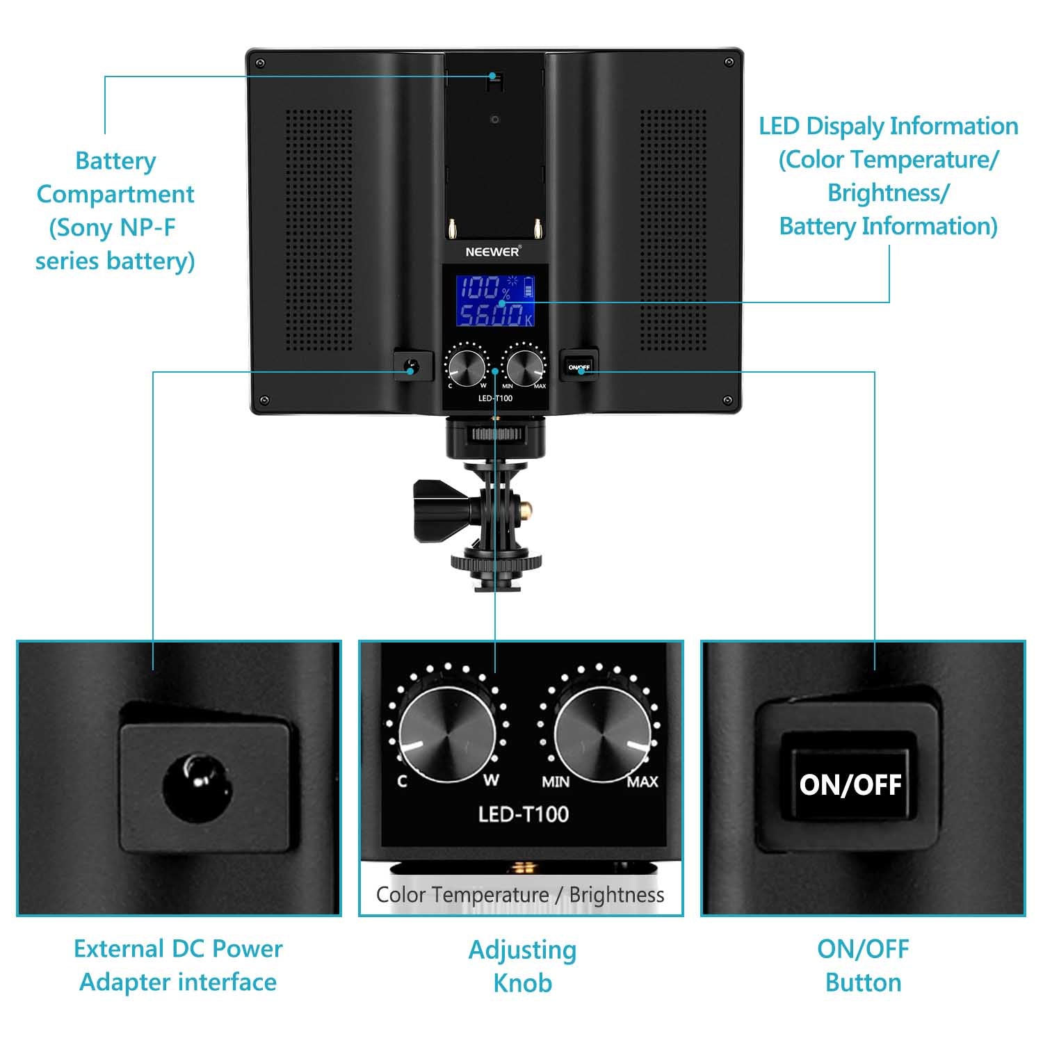 - Brightness and color temperature ranges from 3200 to 5600K can be controlled by a separate dimmer knob.