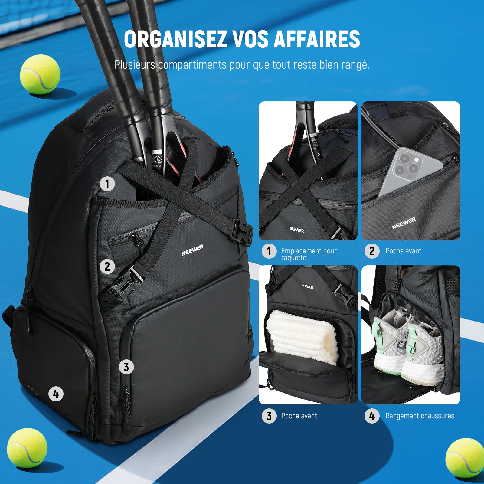 - 【Organisez vos affaires】 Les multiples compartiments de ce sac de tennis vous permettent de ranger vos affaires : un compartiment principal spacieux, un porte-raquettes sécurisé avec sangles à boucles croisées, deux poches avant et deux poches intérieures pour vêtements, serviettes et téléphones, une poche latérale en filet pour les bouteilles d'eau et un compartiment à chaussures ventilé avec housse anti-poussière.
