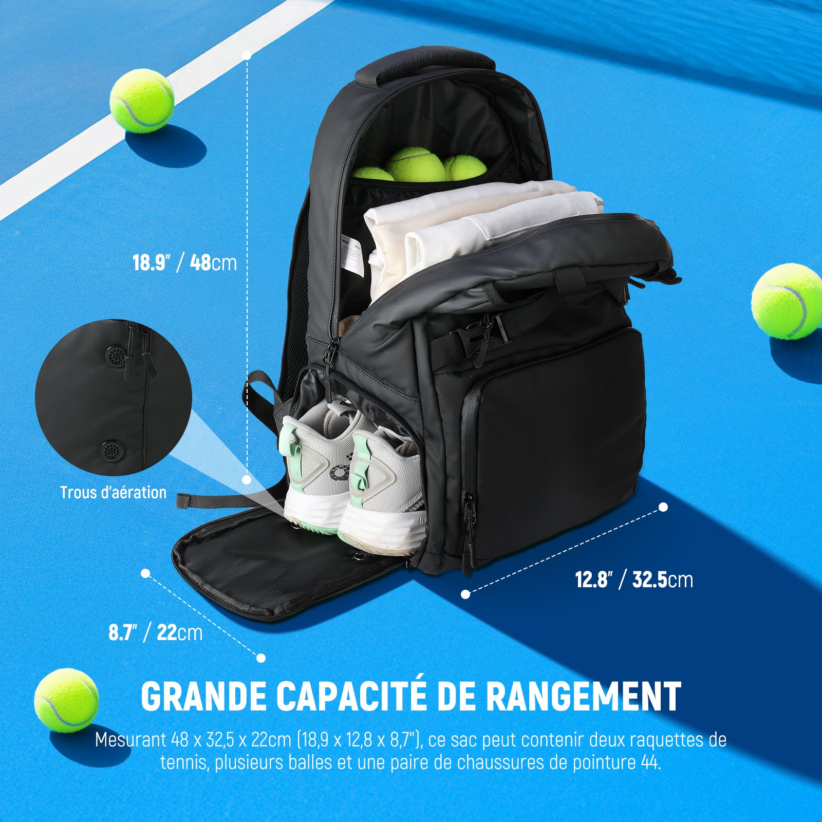 - 【Grande capacité de rangement】 Suffisamment spacieux pour contenir deux raquettes de tennis, plusieurs balles et même des chaussures de pointure 46, ce sac à dos mesure 48 x 32,5 x 22 cm et convient à toutes les tailles. Il est idéal pour les hommes comme pour les femmes.