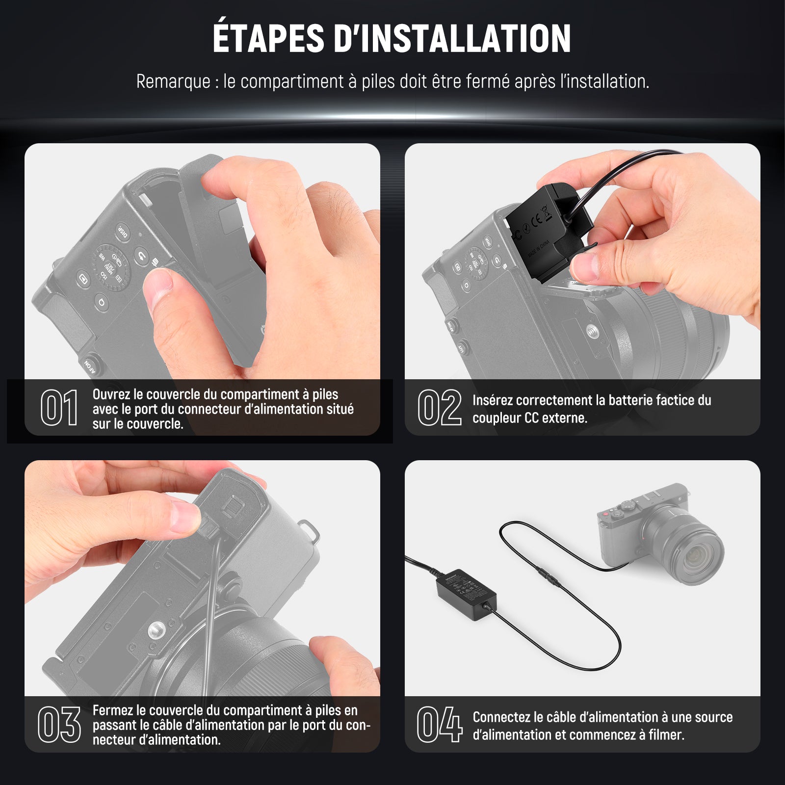 - 【Remarques】Cette batterie factice DMW-BLK22 sert à fournir une alimentation constante à votre appareil photo, mais ne peut PAS charger les batteries ; la batterie factice doit être utilisée avec l'adaptateur secteur et le cordon d'alimentation ; REMARQUE : assurez-vous que le couvercle de la batterie est complètement fermé pour qu'elle fonctionne