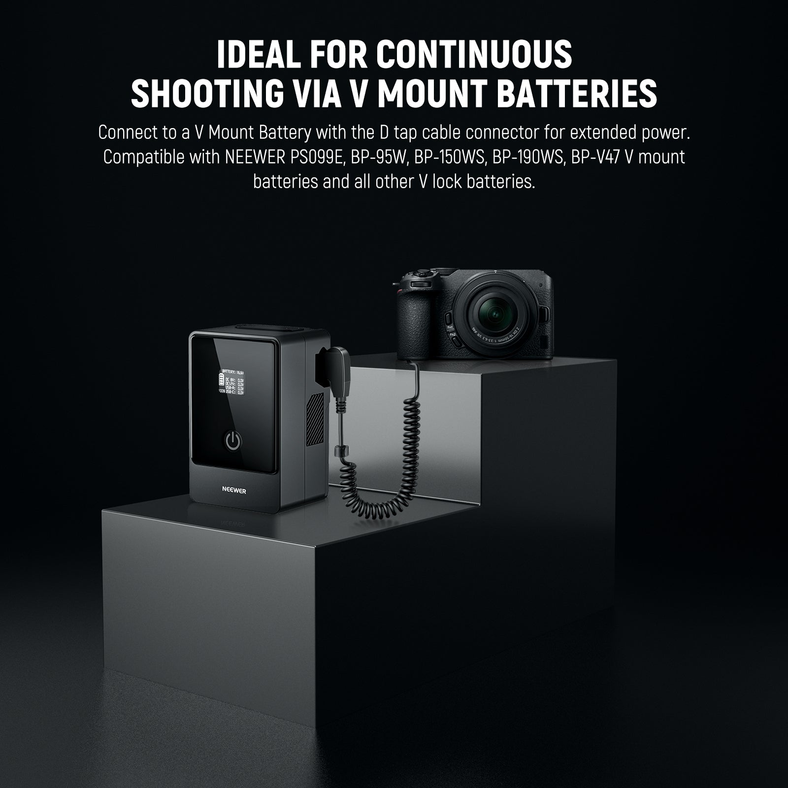 - 【Idéal pour la prise de vue continue via des batteries à montage en V 】avec un connecteur de câble D Tap, il peut fonctionner avec les batteries NEEWER PS099E, BP-95W, BP-150WS, BP-190WS, BP-V47 V et toutes les autres batteries V Lock. Compatible avec SmallRig v mount la série de batteries, compatible avec Sony BP-U65 BP-U68 BP-U100 BP-U90 V mount les batteries