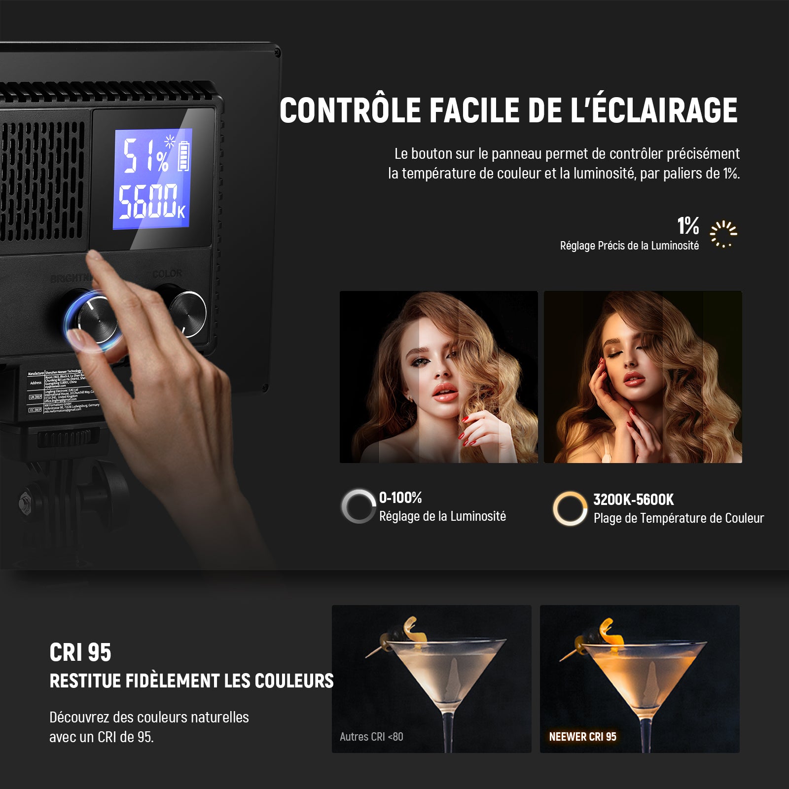 - Contrôle de précision amélioré : ce panneau lumineux LED permet un réglage précis de la température de couleur et de la luminosité. L'interrupteur d'alimentation peut être facilement basculé en une seule pression. La luminosité et la température de couleur peuvent être réglées avec précision à l'aide de boutons, chaque incrément étant de 1 %. La luminosité peut être ajustée de 0 % à 100 %, tandis que la température de couleur varie de 3200 K à 5600 K, répondant à diverses exigences de prise de vue