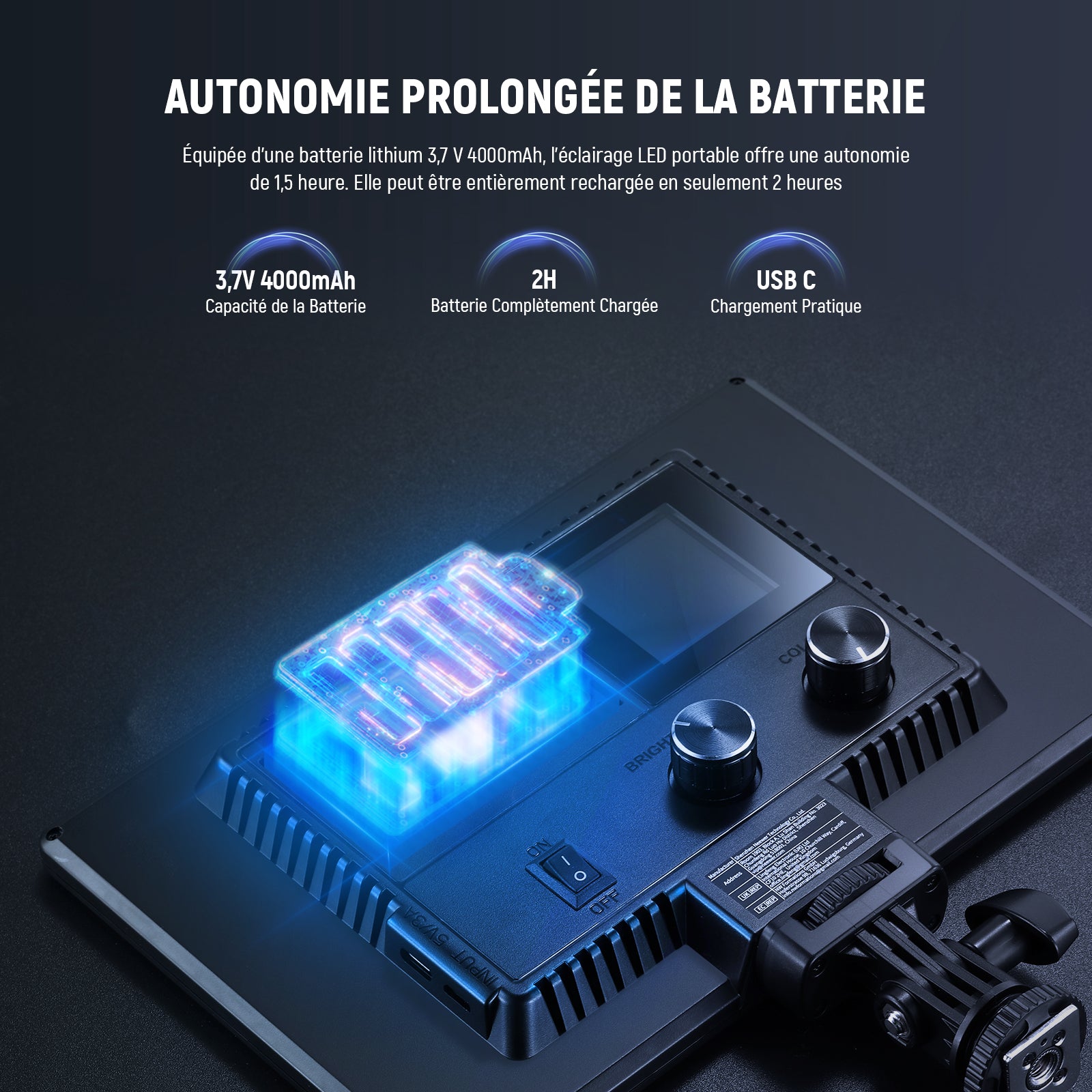 - Autonomie prolongée de la batterie et chargement pratique : équipée d'une batterie au lithium intégrée de 3,7 V 4000 mAh, la lumière LED portable offre une autonomie de 1,5 heure. Il peut être complètement chargé en seulement 2 heures, prenant en charge les ports de type C et USB pour un chargement sans tracas. Un câble de charge USB C est inclus pour plus de commodité