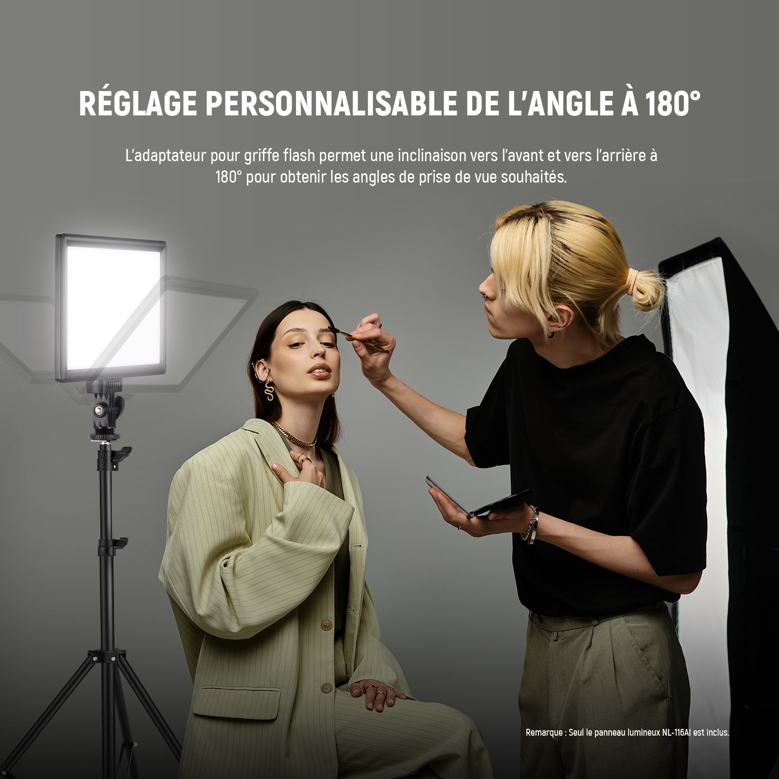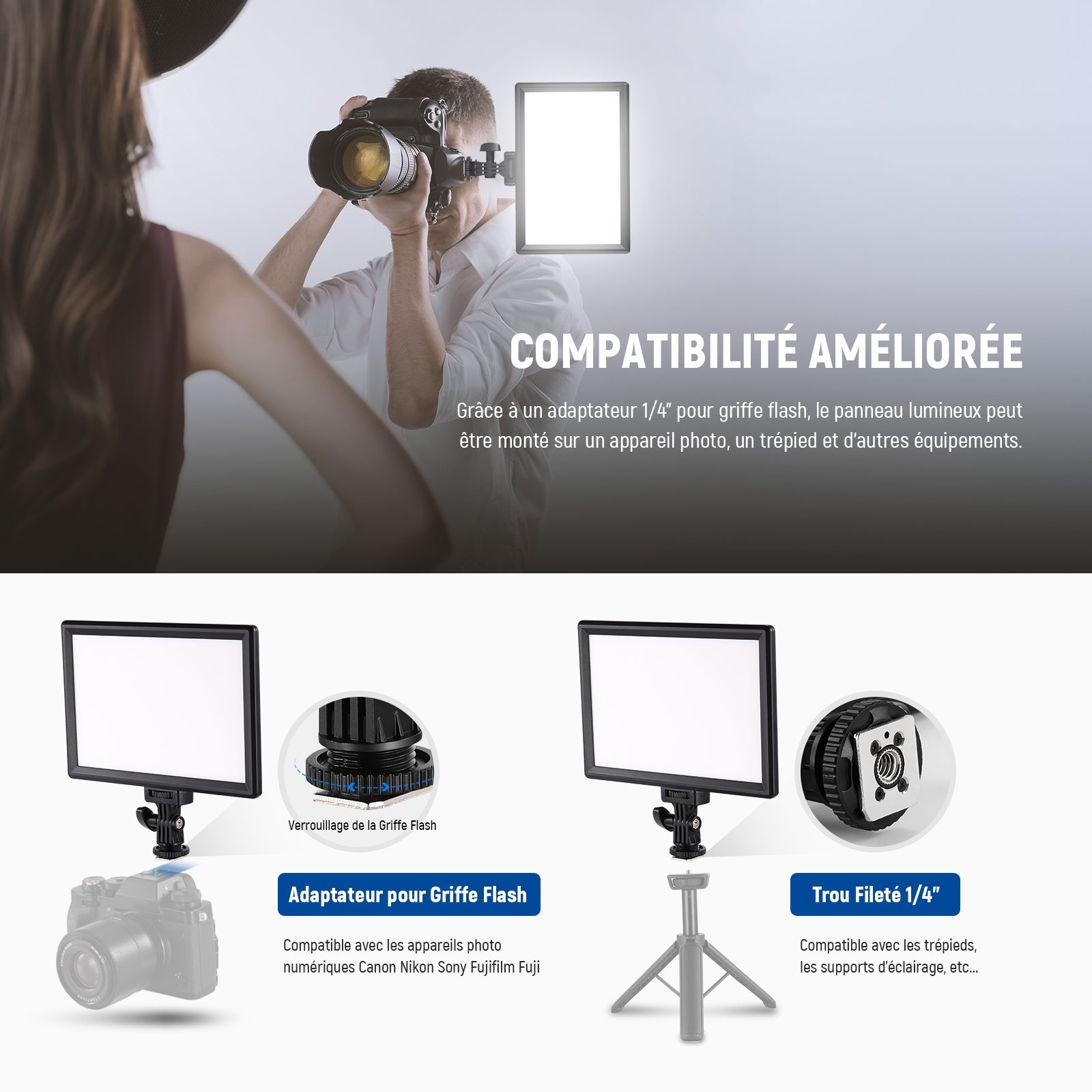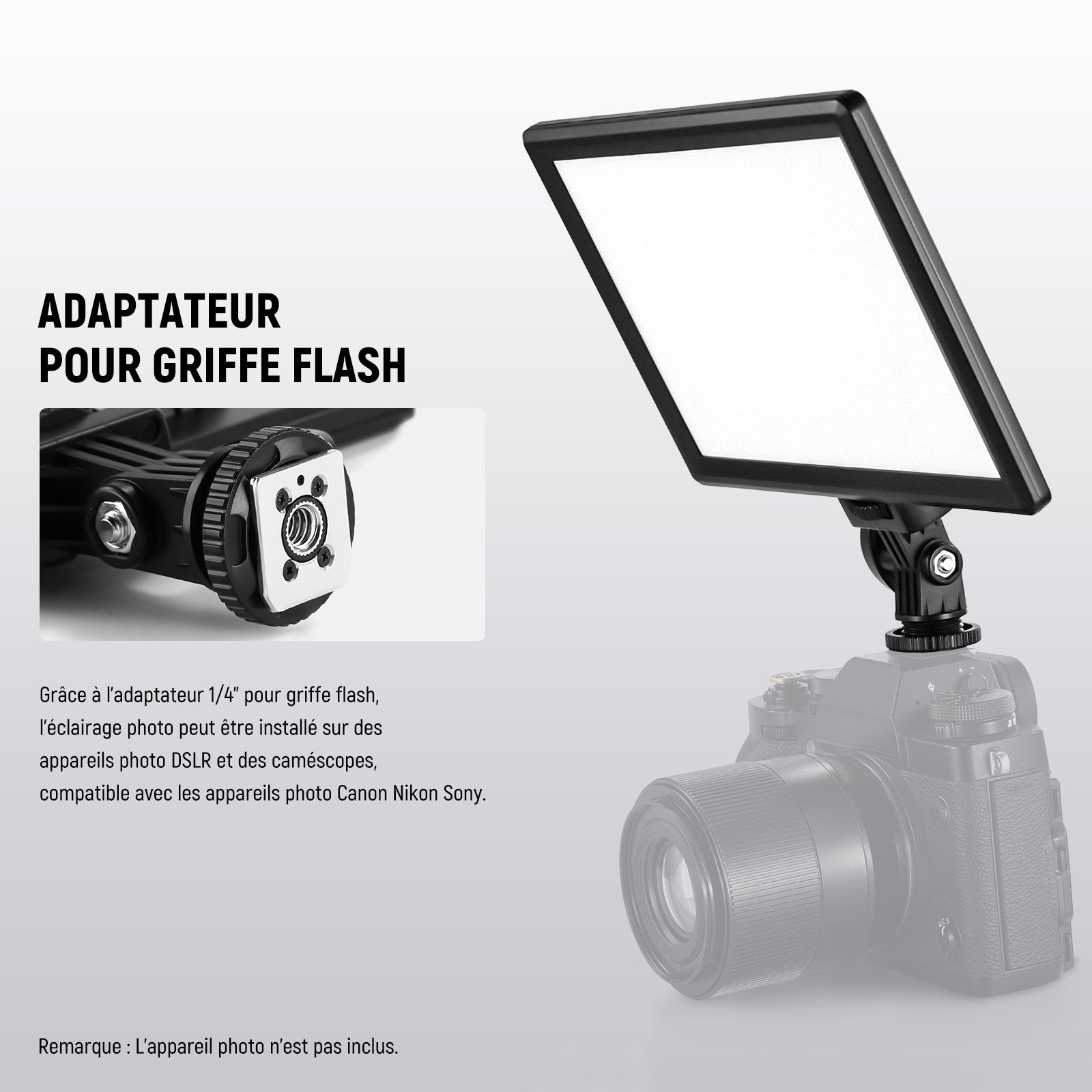 - Montage flexible avec adaptateur griffe : avec un adaptateur griffe de 6,35 mm, la lumière de remplissage de photographie peut être installée sur le dessus des appareils photo reflex numériques et des caméscopes, compatible avec les appareils photo Canon, Nikon, Sony, et permet une inclinaison à 180° à l'avant et à l'arrière pour les angles de prise de vue souhaités