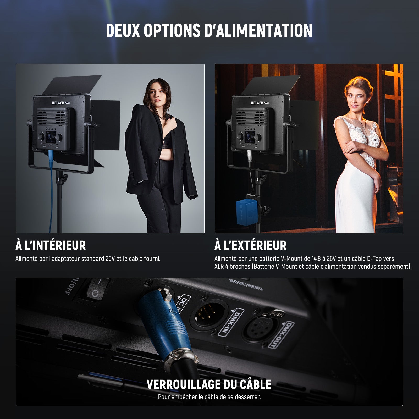 - 【Deux Options d'Alimentation pour l'Éclairage en Intérieur et en Extérieur】 Ce panneau vidéo portable fonctionne sur secteur grâce à l'adaptateur 20V AC et au câble d'alimentation fournis. Si les prises murales ne sont pas disponibles, alimentez-le avec une batterie V Mount (14,8-26V) et un câble D Tap vers XLR 4 broches (batterie et câble D Tap vendus séparément). Le port DC possède un système de verrouillage pour éviter tout débranchement accidentel de l'alimentation lors de l'utilisation
