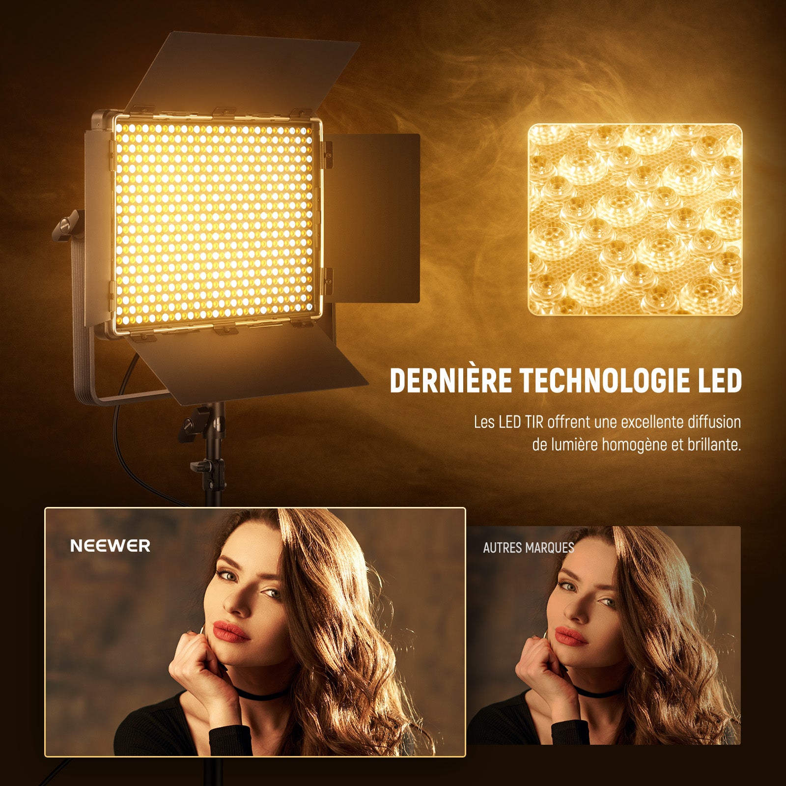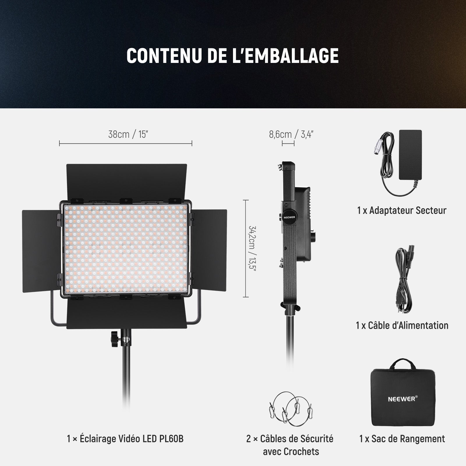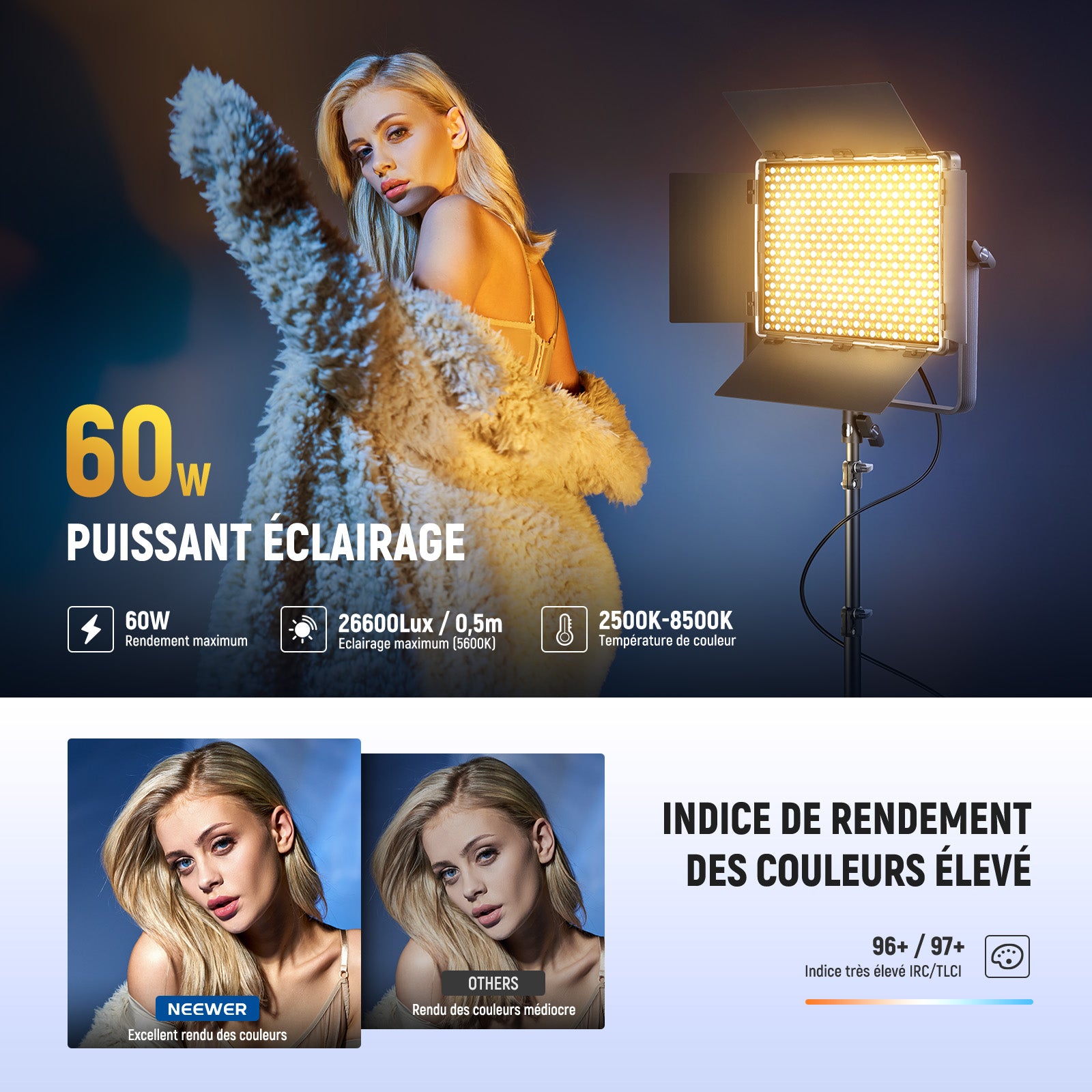 - 【Panneau Lumineux Bicolore Haute Puissance 60W】 Le PL60B possède un design optique LED avancé et un module de lentille TIR pour une lumière intense et de qualité. La puissance de 60W avec 640 LED produit un éclairement allant jusqu'à 26600Lx/0,5m, un CRI élevé de 96+, TLCI supérieur à 97 pour une reproduction fidèle des couleurs. Passage du mode chaud au mode froid de 2500 à 8500K, idéal pour l'éclairage principal ou d'appoint pour les vidéos, podcasts, interviews, le streaming, les photos…