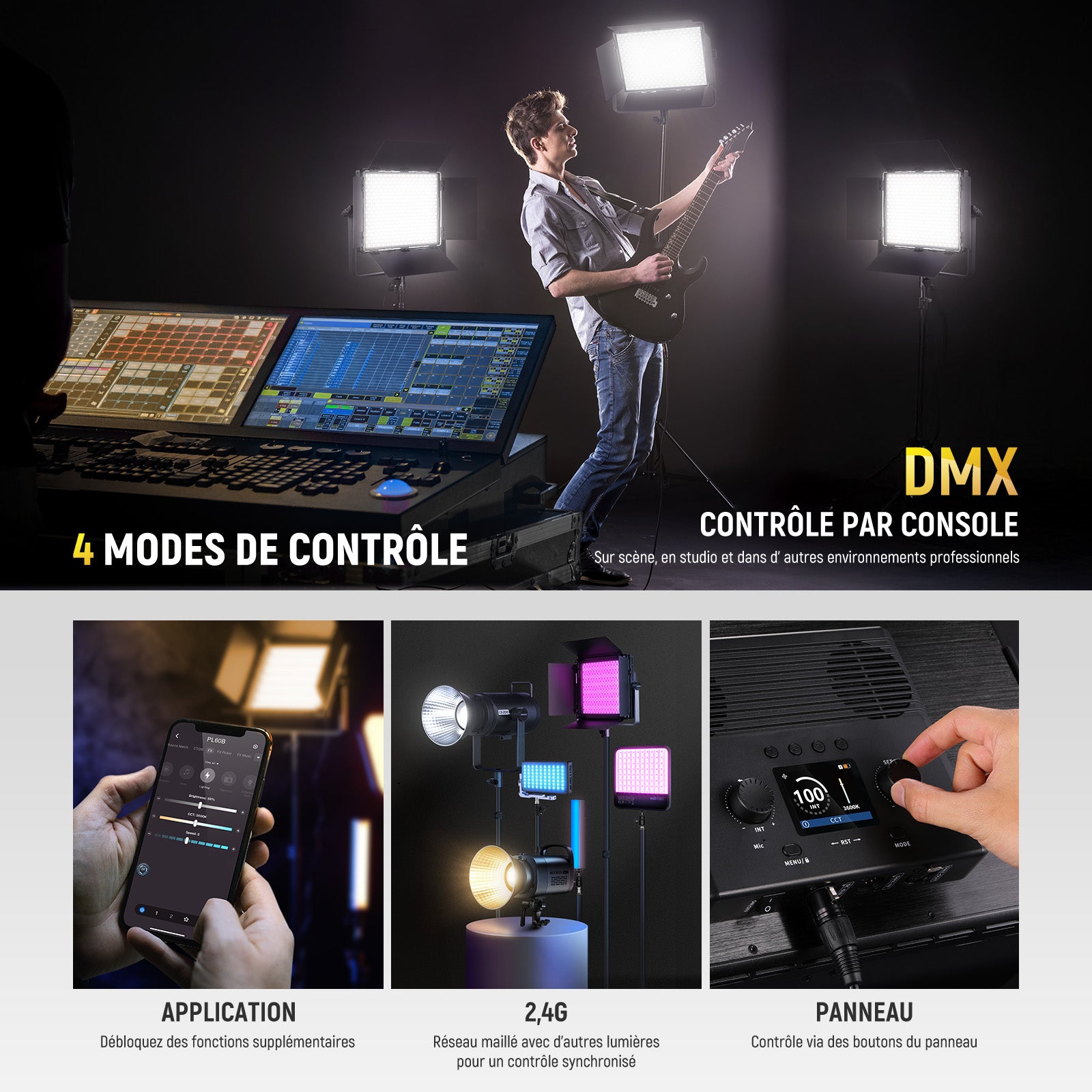 - 【Contrôle APP/2,4G/Panneau/DMX】 4 méthodes de contrôle pour répondre aux pros et novices. L'APP NEEWER permet le contrôle sans fil et la gestion de plusieurs groupes d'éclairage ; le module 2,4G intégré permet un contrôle maître-esclave de différents modèles d'éclairage (AP150C, FS300C, FS150C, RGB2, RGB1200, MS150B, FS150B...) ; le panneau avec un écran couleur TFT affiche clairement les paramètres ; un port DMX à 5 broches peut être relié à une console DMX pour les installations complexes