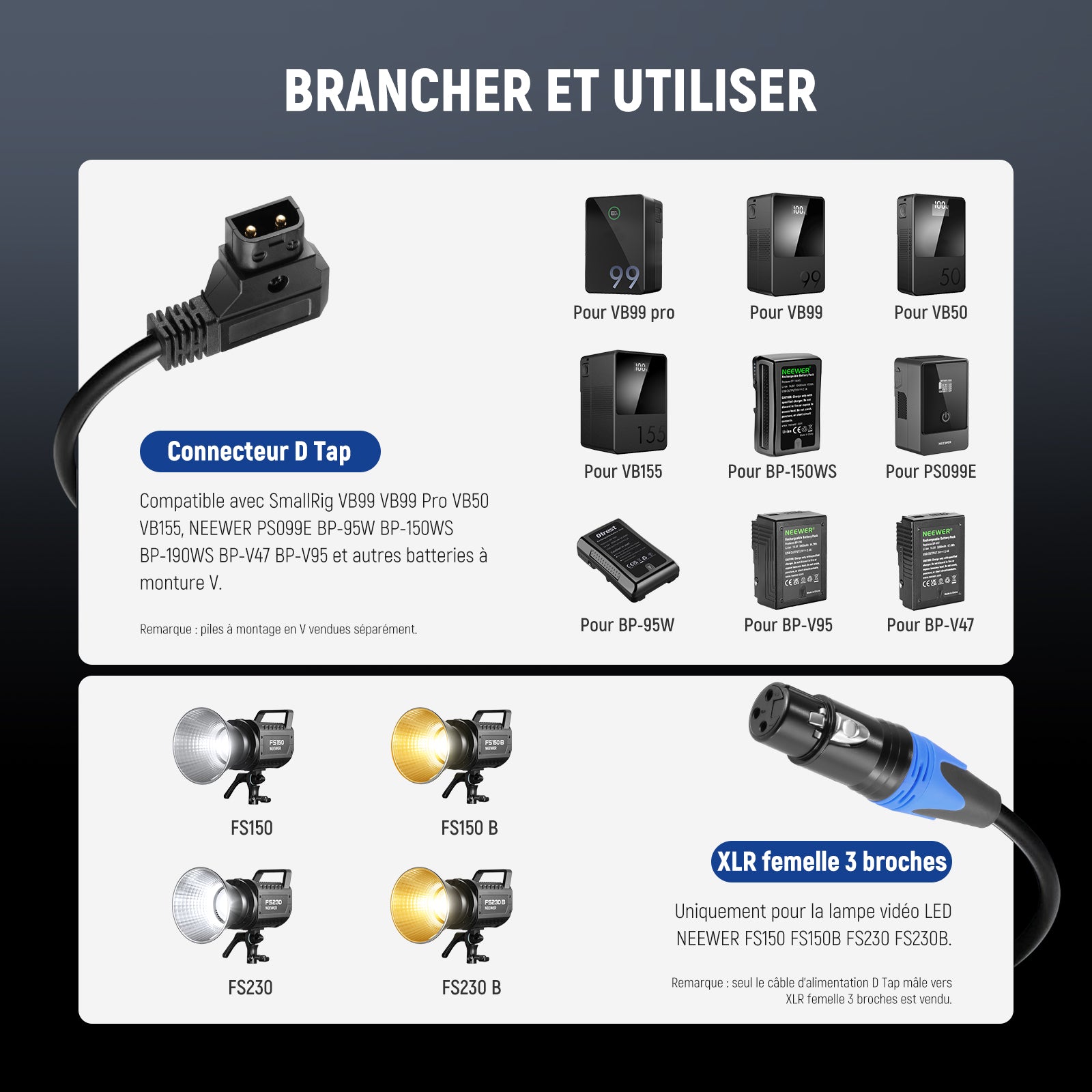 - 【Lumières d'alimentation avec piles à montage en V】 Ce câble D Tap vers XLR 3 broches est conçu pour les lumières de la série NEEWER FS. Compatible avec SmallRig V Mount VB99 VB99 Pro VB50 VB155 batterie NEEWER PS099E BP-95W BP-150WS BP-190WS BP-V47 BP-V95 et autres batteries à monture V. Remarque : piles non incluses. Batteries 28 V à montage V non prises en charge