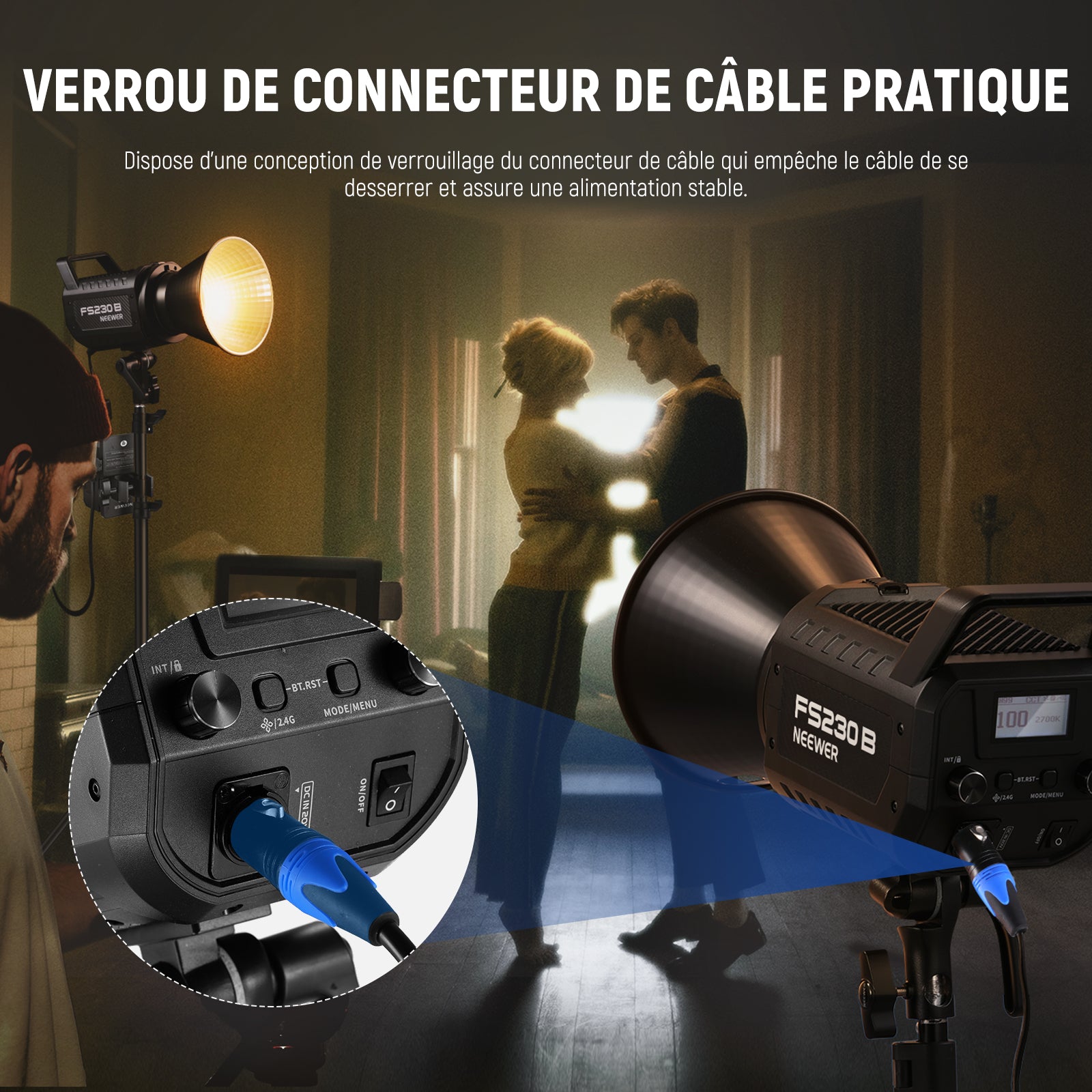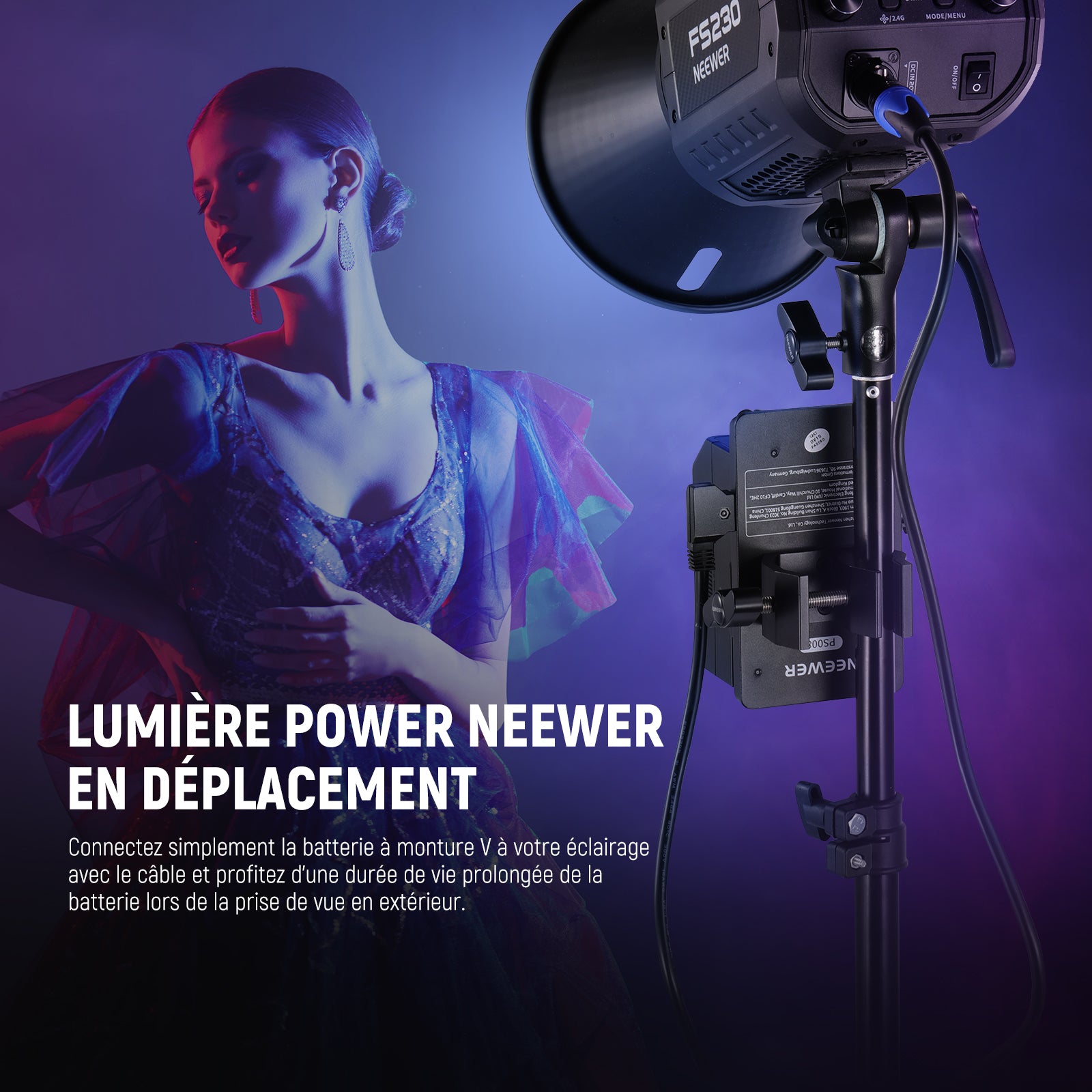 - 【Transformez votre lampe FS en éclairage extérieur】Connectez ce câble de batterie à montage en V pour alimenter les lampes vidéo LED NEEWER FS150, FS150B, FS230 et FS230B, puis vous pourrez alimenter la lumière partout où vous allez