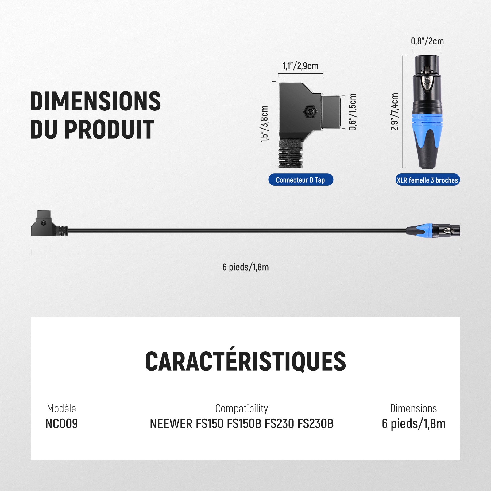 NEEWER NC009 Câble D-Tap vers XLR 3 broches pour lumière vidéo LED FS150, FS150B, FS230, FS230B