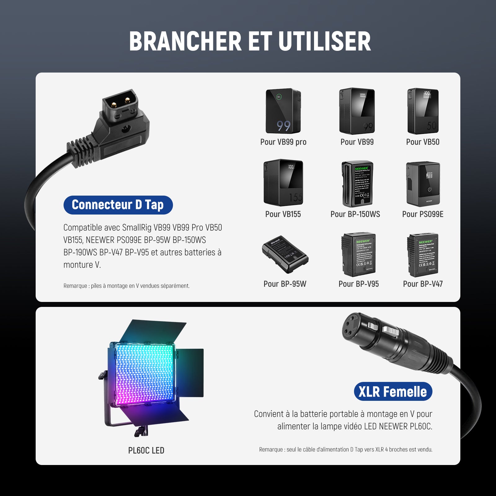 • 【Alimentez la lumière NEEWER en déplacement】 Aide à alimenter la lampe vidéo LED NEEWER PL60C avec une batterie portable à montage en V pour la prise de vue en extérieur