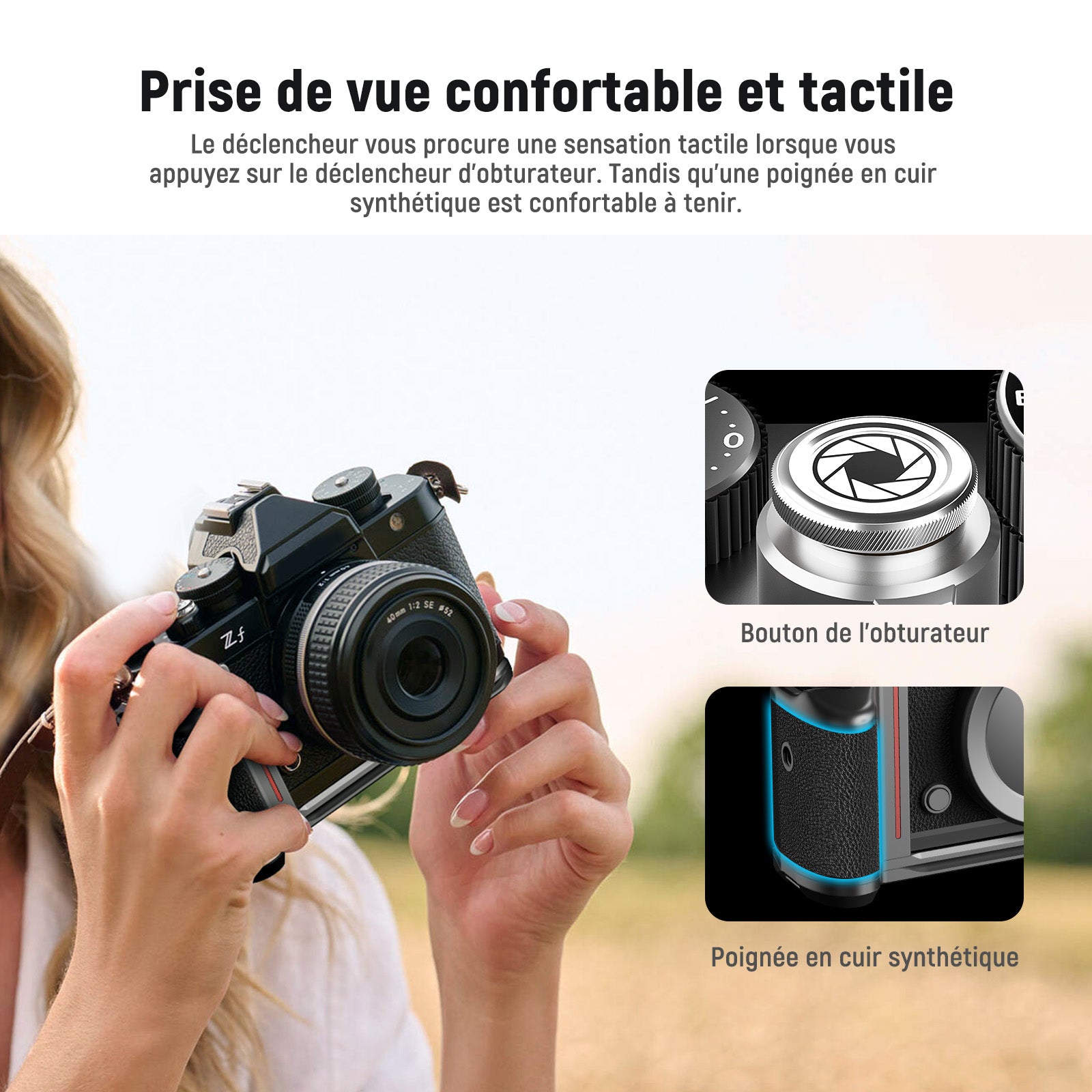 - Compatible avec Nikon Zf- Compatible avec Nikon Zf, cette plaque de base rétro est un hommage à l'époque des appareils photo argentiques classiques. Elle se fixe à l'appareil photo grâce à une vis 1/4" et permet de garder le compartiment de la batterie parfaitement accessible. Un élégant capuchon de bouton d'obturateur en aluminium argenté s'intègre parfaitement au boîtier de l'appareil photo et apporte une sensation plus tactile.