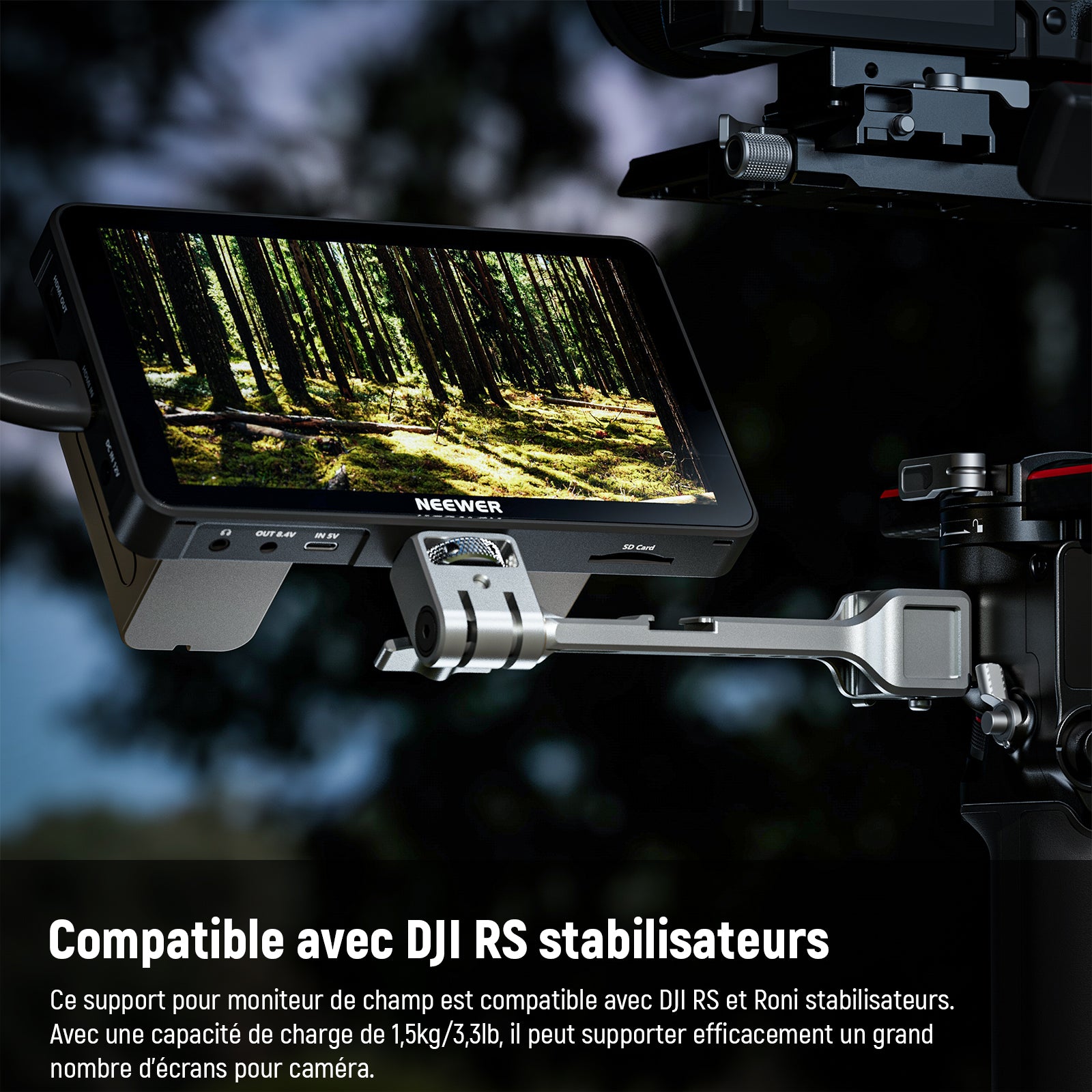 - Compatible avec les stabilisateurs DJI RS : ce support de moniteur de terrain est compatible avec les stabilisateurs de cardan DJI RS et Ronin. Avec une capacité de charge de 3,3 kg/1,5 kg, il peut soutenir fermement une large gamme de moniteurs d'appareil photo