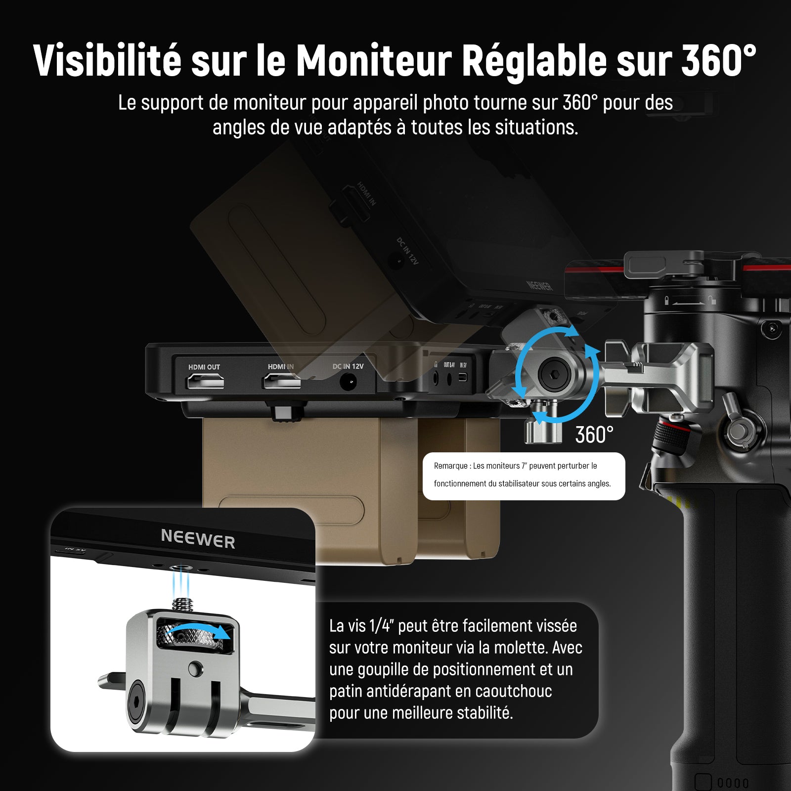 - Vue de surveillance flexible à 360° : le support de moniteur d'appareil photo est rotatif à 360° pour des angles de vue flexibles dans toutes les situations. La vis de 6,35 mm peut être facilement enfilée dans votre moniteur via la molette avec une broche de localisation et un coussinet en caoutchouc antidérapant pour une meilleure stabilité