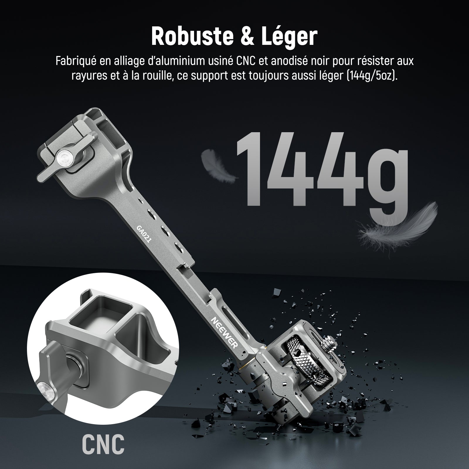 - Construction robuste et légère : fabriqué en alliage d'aluminium anodisé noir usiné CNC, pour une résistance aux rayures et à la rouille, ce support est toujours léger (144 g), parfait pour la création en extérieur dans n'importe quel environnement complexe