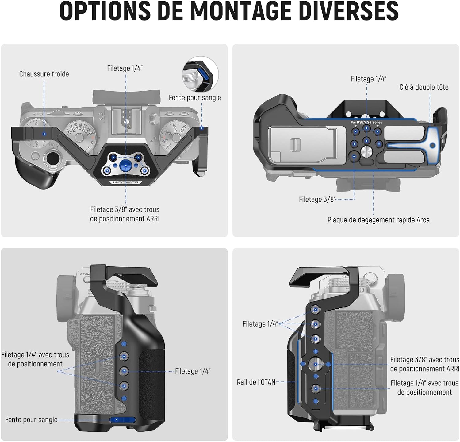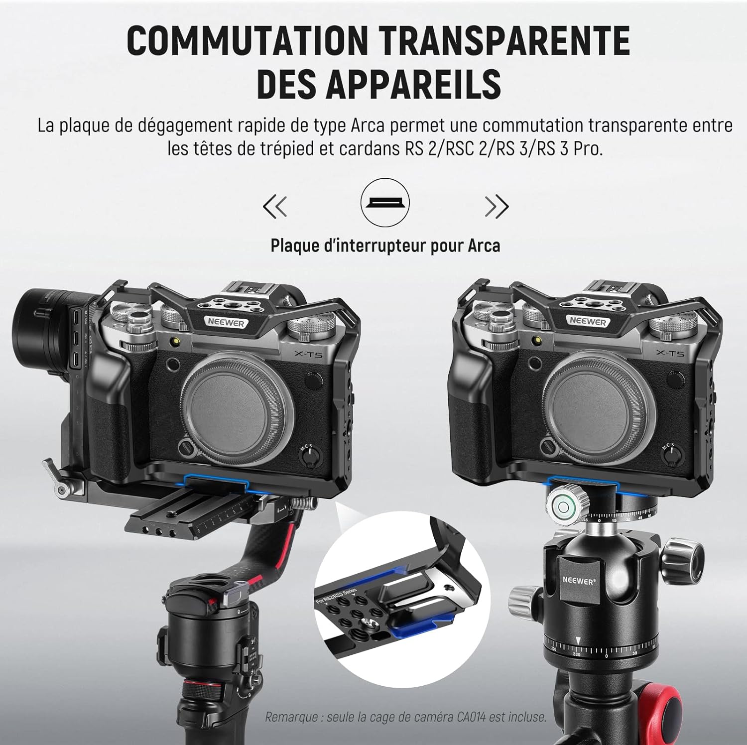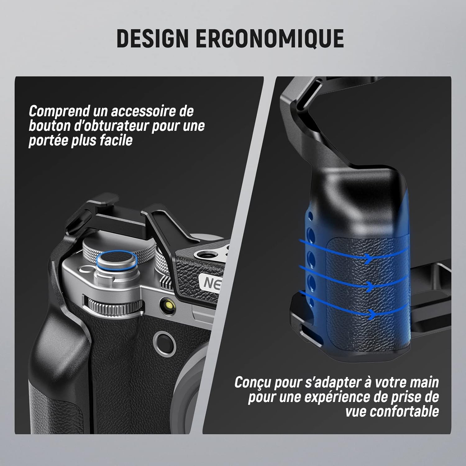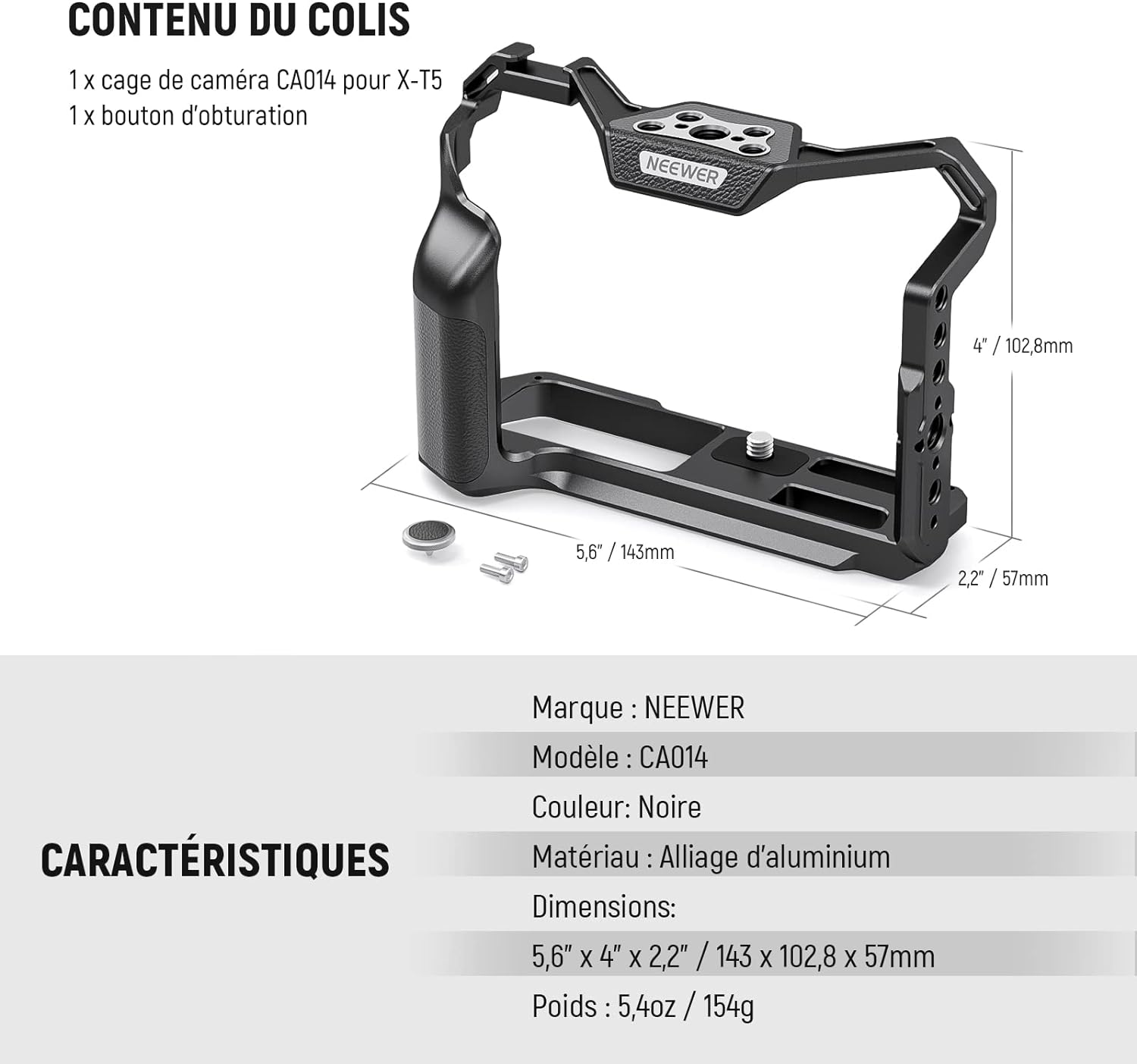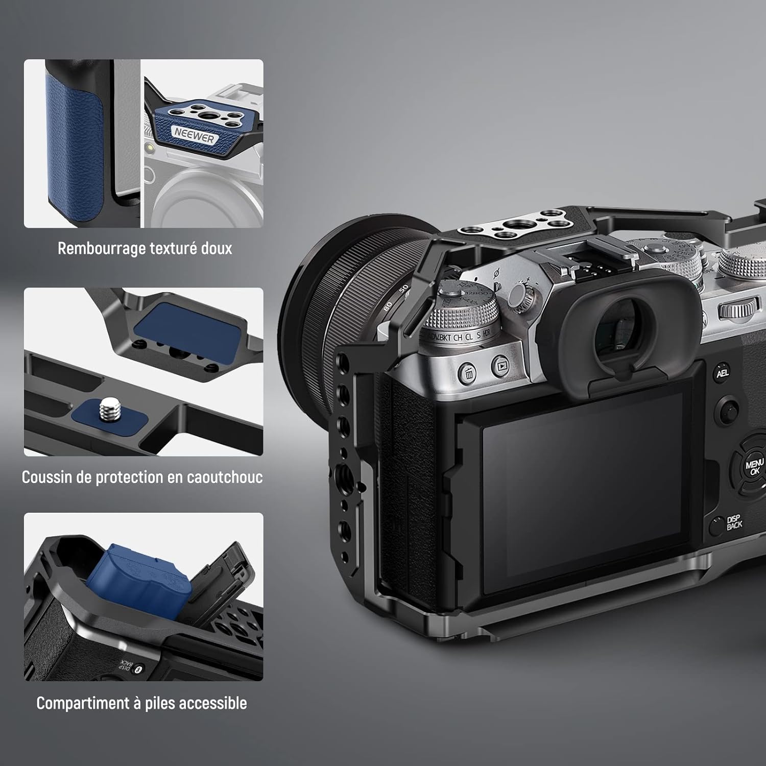 - 【Cage d'appareil photo X-T5 mince et ajustée】NEEWER CA014 est compatible avec Fujifilm X-T5. Mince et ajustée, cette cage peut protéger adéquatement l'appareil photo et améliorer la prise de vue à main levée sans ajouter d'encombrement. La conception creuse garantit aucun blocage des boutons, des fentes pour cartes, de l'écran et du couvercle de la batterie, et comprend également une fixation de bouton d'obturation pour une portée plus facile.