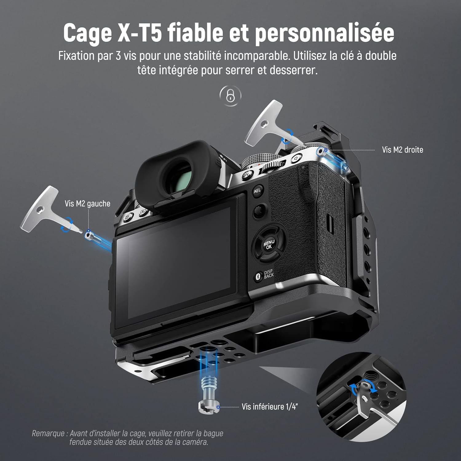 - 【Conception anti-torsion et antidérapante】 Votre caméra X-T5 sera sécurisée par trois points de vis: la vis inférieure 1/4" et deux vis M2 des deux côtés pour une stabilité incroyable. Un tournevis stocké magnétiquement sous la cage peut aider à serrer les vis. Des coussinets en caoutchouc antidérapants à l'intérieur de la cage protégeront votre précieux appareil photo des rayures.