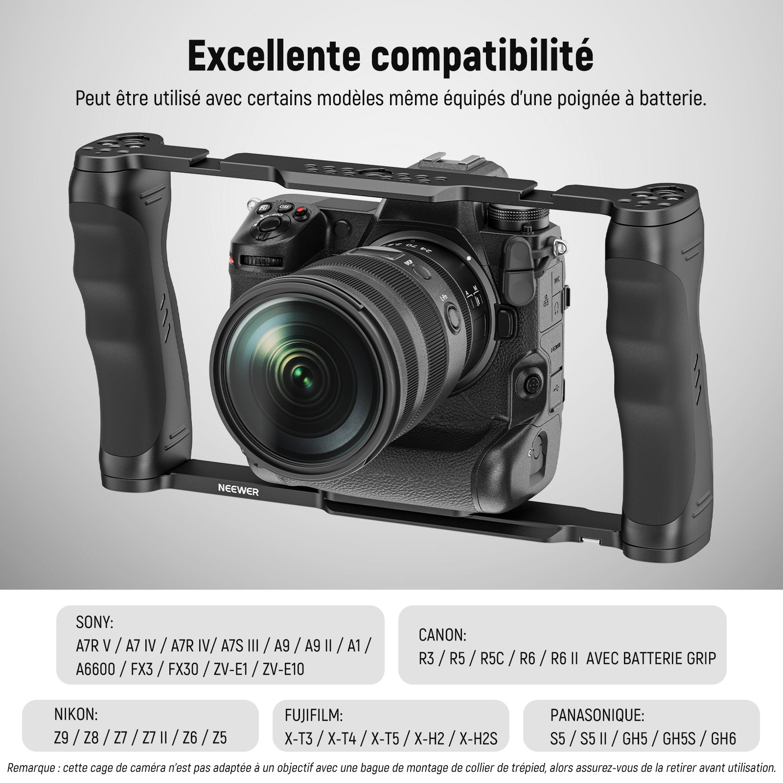 • 【Plus d'appareils photo compatibles】 Compatible avec Sony Alpha 7C Alpha 7 III Alpha 7R IV Alpha 9 II Alpha 6600 Canon EOS R6 R5C R5 R3 90D Nikon Z9 Z7 Z7II Z6 Z6II Fujifilm X T4 Blackmagic 4K 6K et autres appareils photo DSLR DSLM. Remarque : cette cage de caméra n'est pas adaptée à un objectif avec une bague de montage de collier de trépied, alors assurez-vous de la retirer avant utilisation.