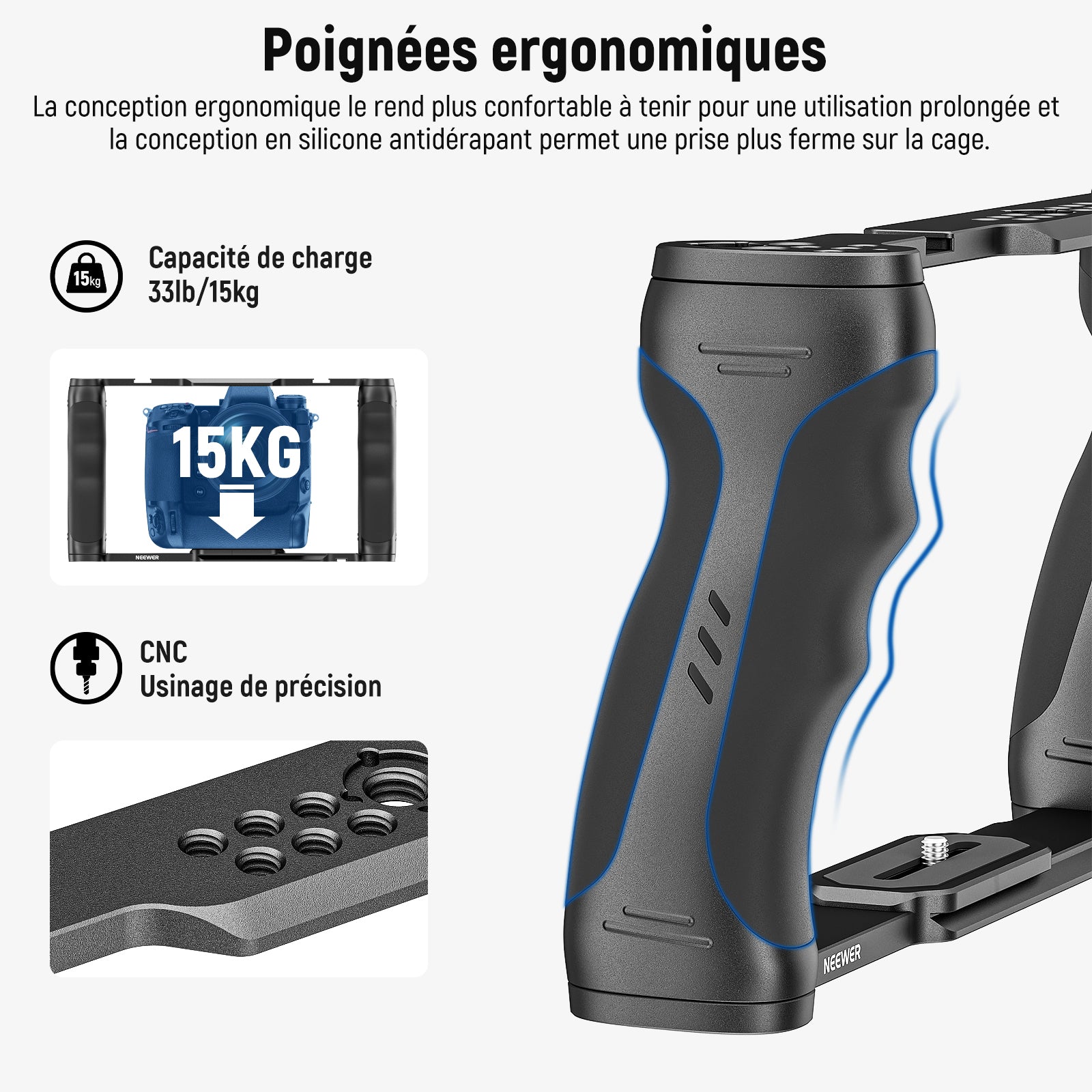 • 【Double poignées et montage sur trépied】 Les deux poignées ergonomiques avec texture en cuir synthétique et contours des doigts vous offrent une prise confortable et ferme sur la cage pour la prise de vue à main levée, ou directement sur la tête du trépied via les trous de vis 1/4" en bas , pour une commutation sans couture entre la prise de vue à main levée et sur trépied, grâce à sa base de type Arca
