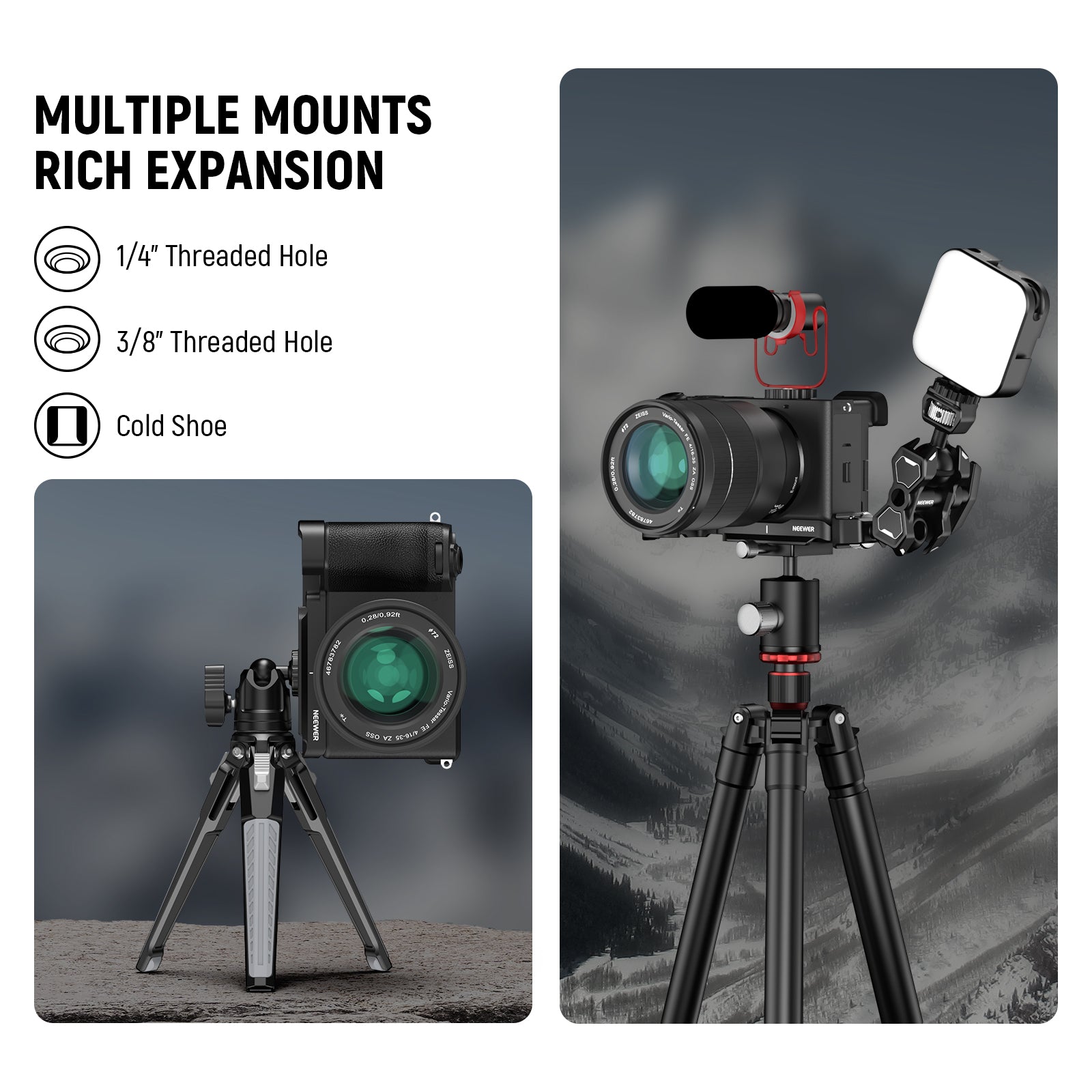- Deux Points Anti-torsion- Fixez votre appareil photo à la plaque de base via une vis de montage de 1/4", et les coussinets en caoutchouc antidérapants stabilisent davantage votre appareil photo et évitent les rayures. Un tournevis à tête plate est stocké magnétiquement sous la plaque de base pour serrer les vis sans outils supplémentaires.