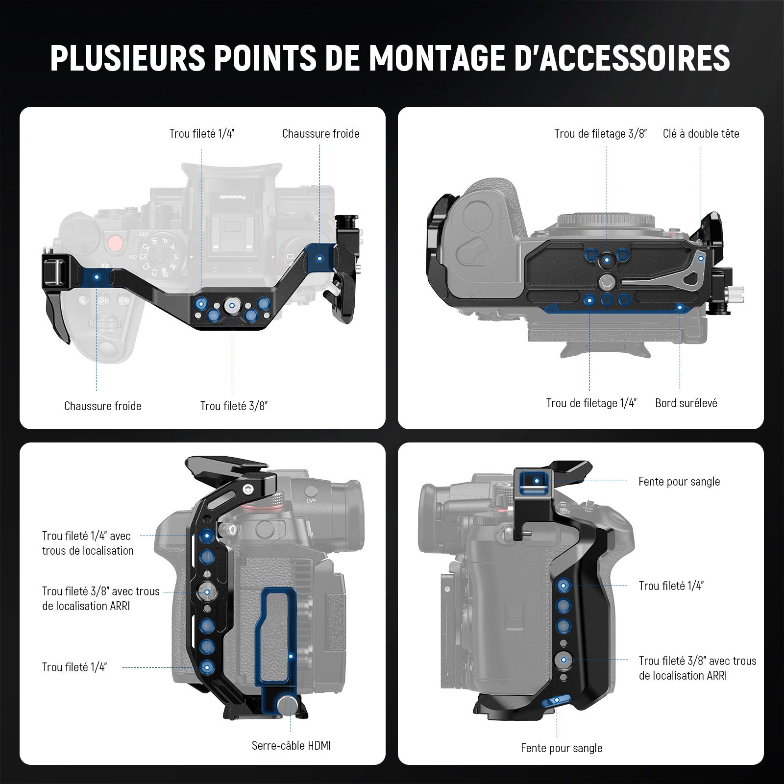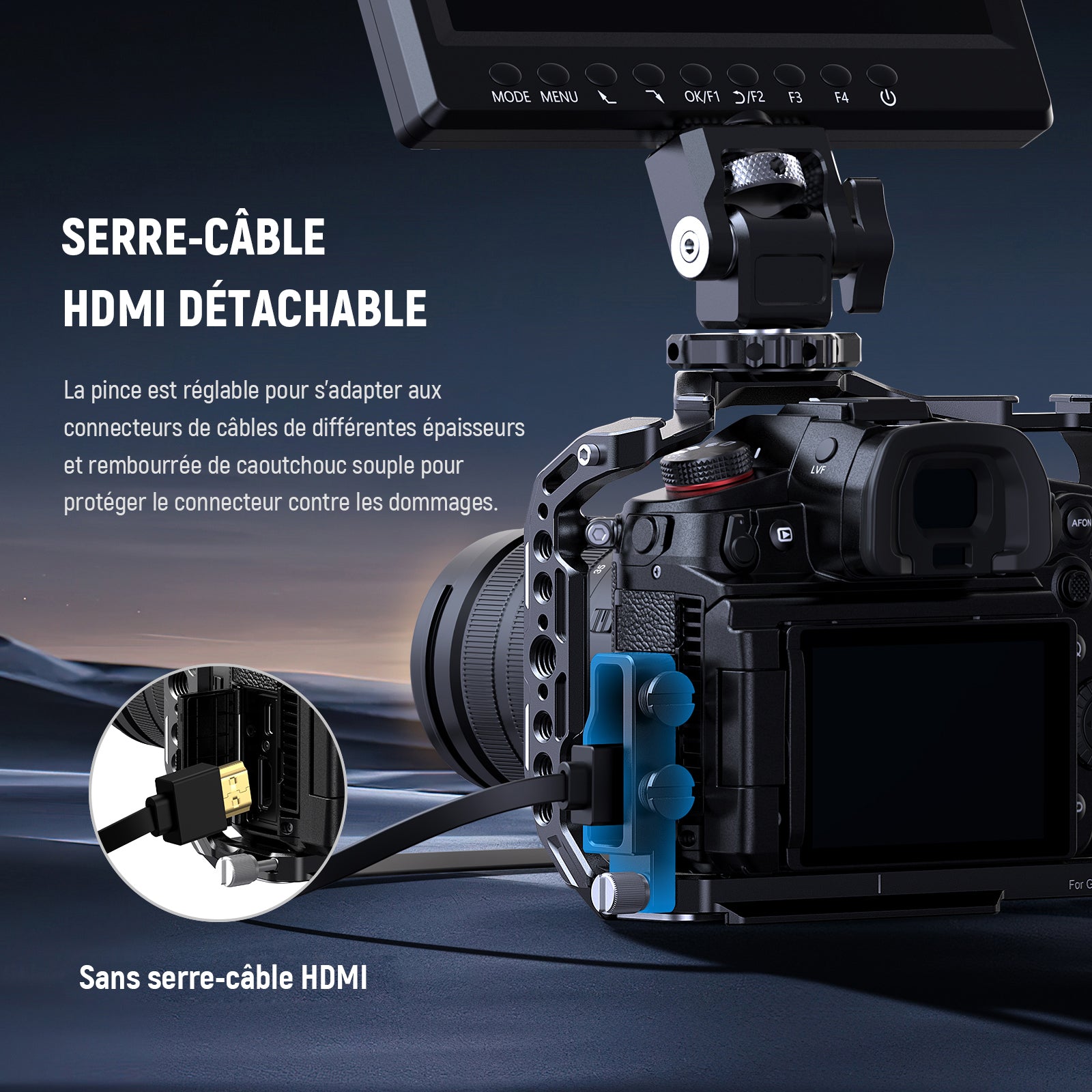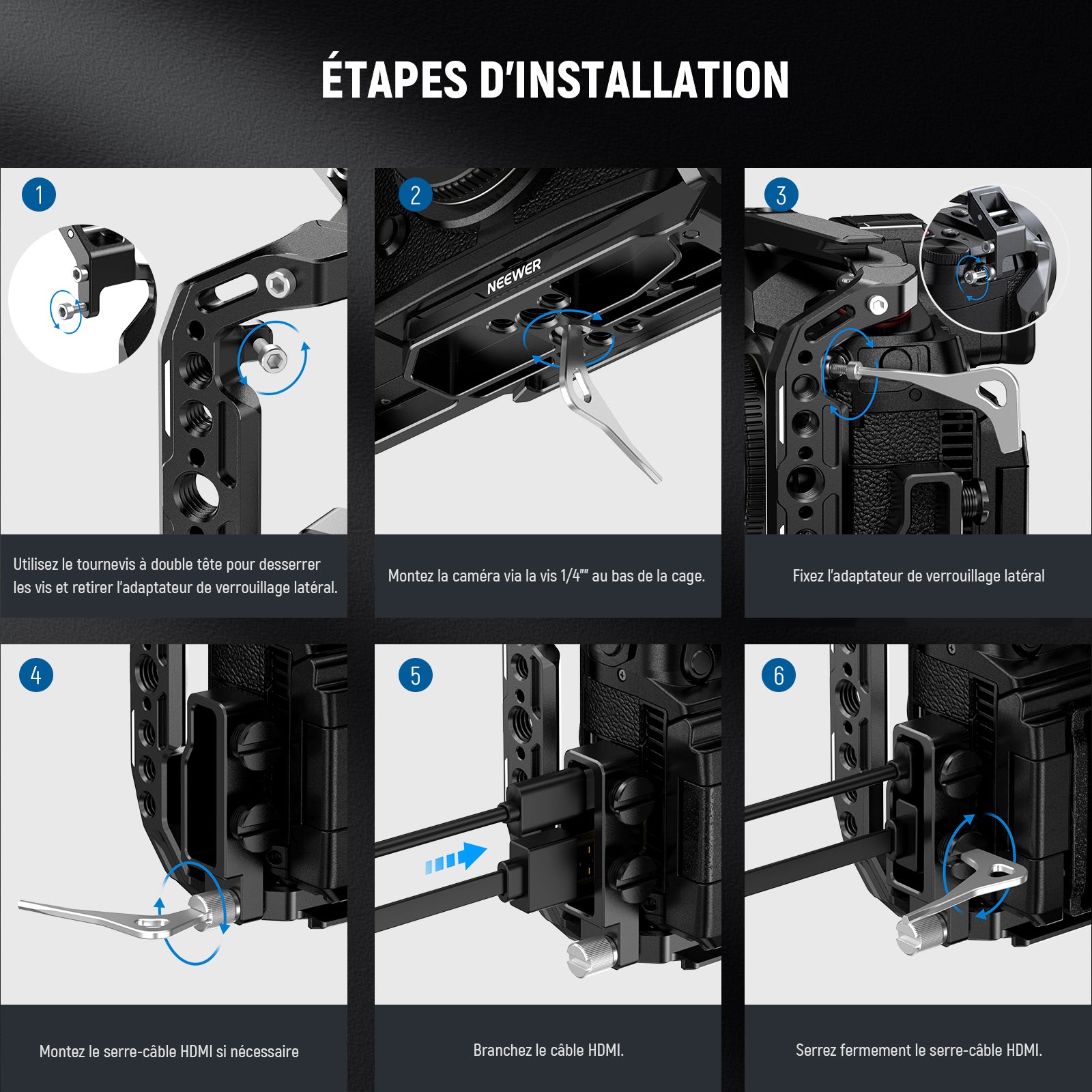 - 【Installation ferme et accès complet】 la cage verrouille fermement la caméra avec une vis inférieure de 1/4" et deux broches anti-torsion. Cette cage ajustée garantit un accès complet aux boutons, aux ports, à l'écran LCD rabattable et au compartiment de la batterie. Un caoutchouc antidérapant. le coussin protège l'appareil photo des rayures
