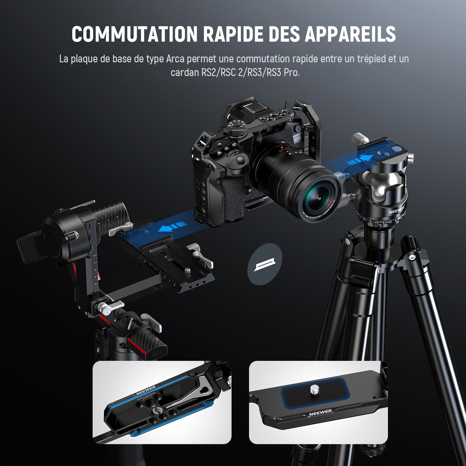 - 【Transferts d'équipement de type Arca】 La plaque de base à dégagement rapide de type Arca vous permet de transférer rapidement la caméra d'un stabilisateur portable à un trépied car elle est parfaitement compatible avec DJI RS 2 RSC 2 RS 3 RS 3 Pro cardans et la plupart des têtes de trépied. Vous pouvez monter cette plate-forme vidéo GH6 sur un trépied dans les orientations horizontale et verticale