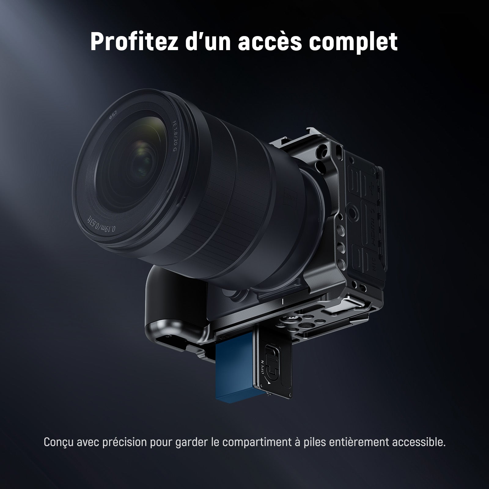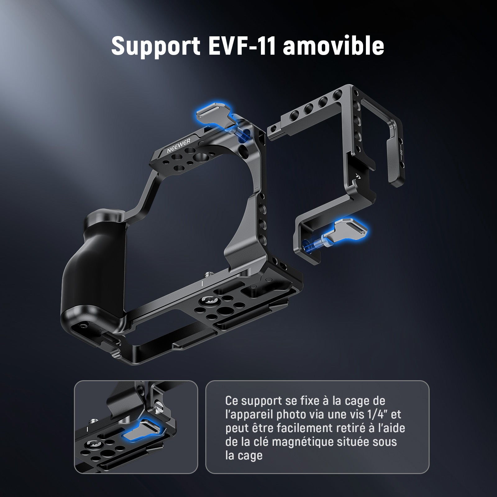 - Support EVF-11 amovible : conçu pour stabiliser le viseur électronique EVF-11 pour une vue haute définition, ce support se fixe à la cage de l'appareil photo via une vis de 6,35 mm et peut être facilement retiré avec la clé magnétique sous la cage