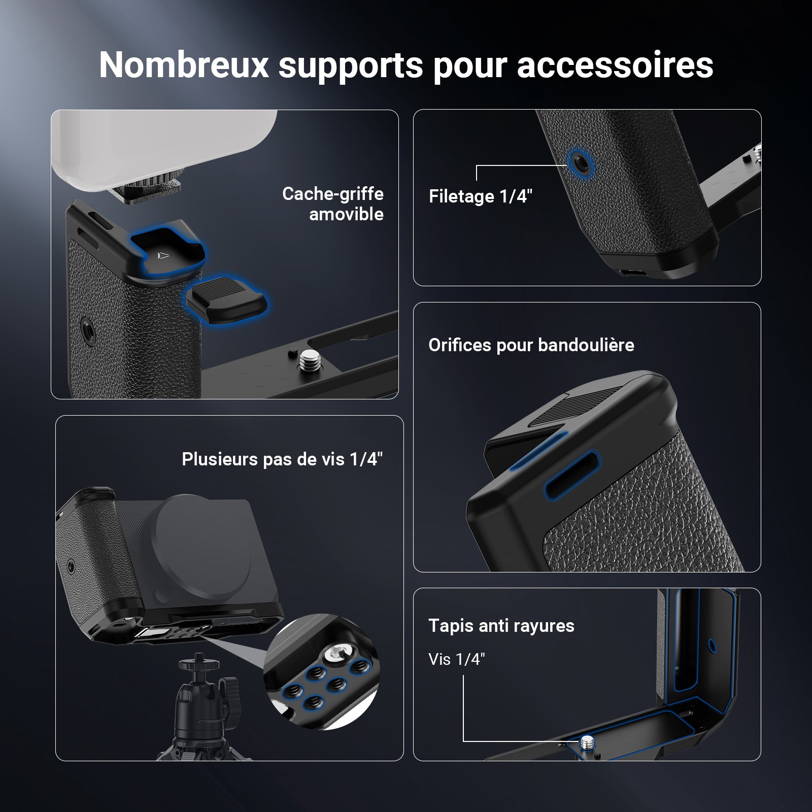 • Griffe froide et filetage 6,35 mm : le support de griffe avec capuchon de protection connecte de petites lumières LED, microphones et autres accessoires d'appareil photo. Plusieurs filetages de 6,35 mm se fixent aux supports d'appareil photo, aux poignées et aux trépieds