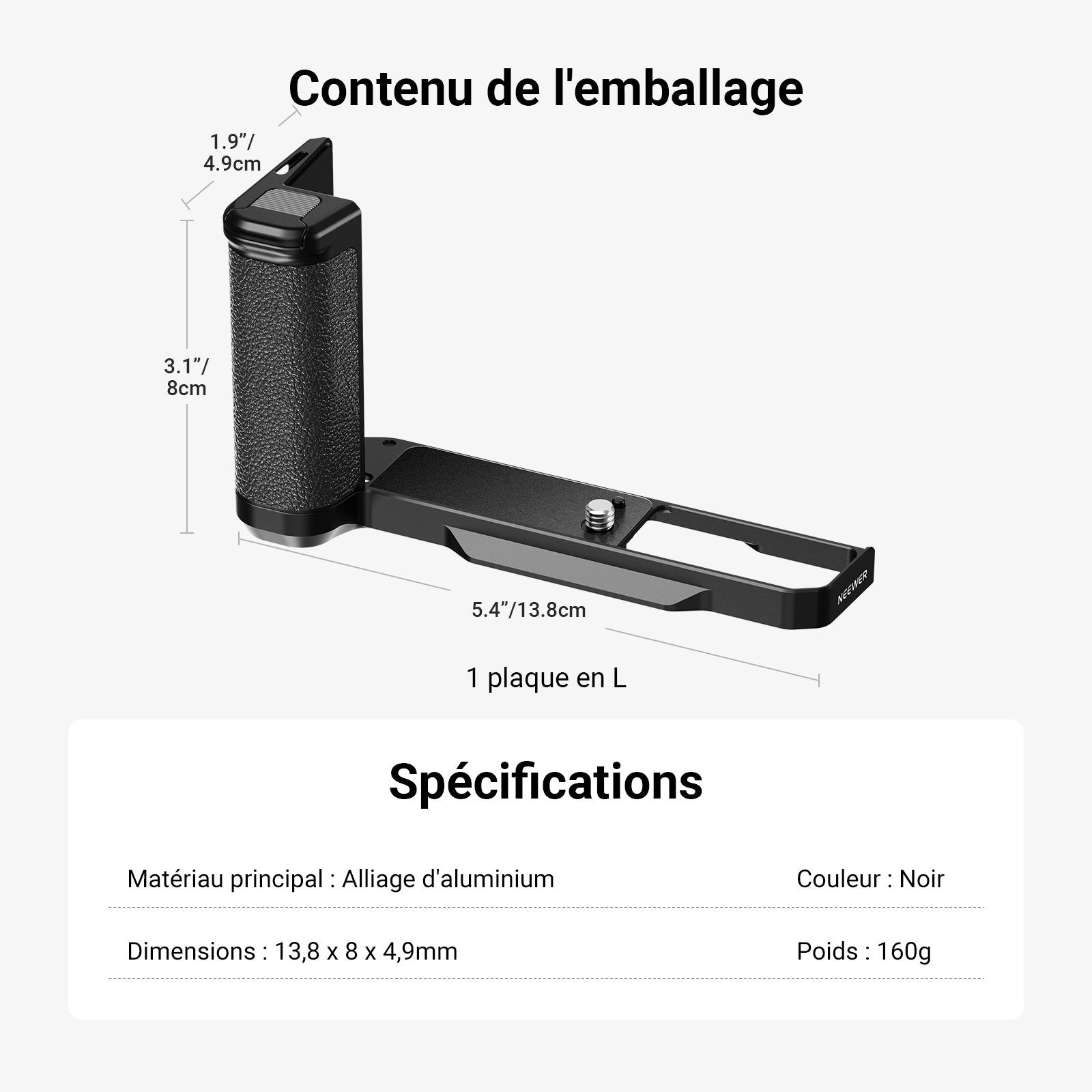 • Fixation rapide et sûre : se connecte à la caméra via une vis de 6,35 mm, avec une broche de localisation pour plus de sécurité. Coussinets en caoutchouc pour protéger contre les rayures