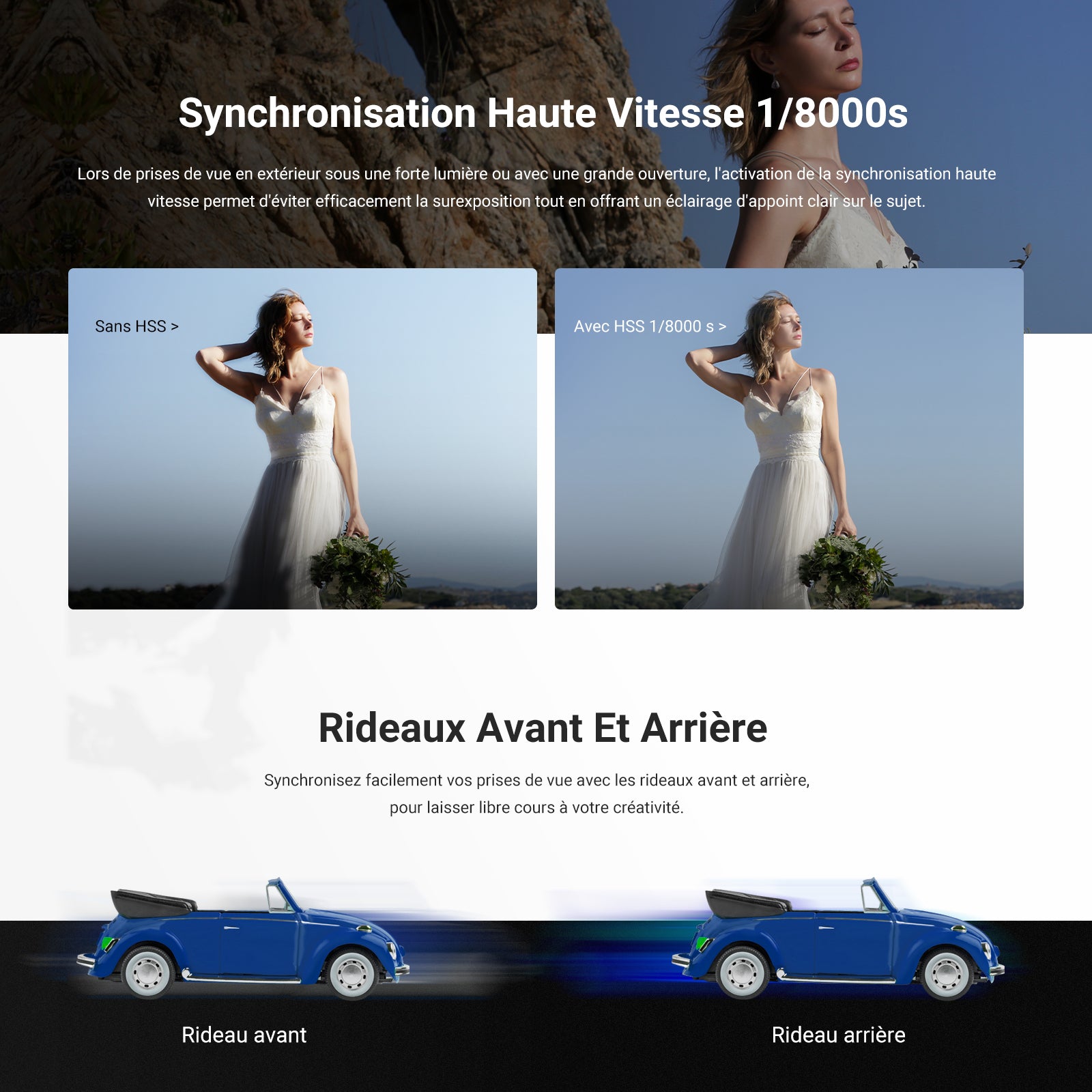 - Sync Modes: HSS (1/8000s), Front Curtain, and Rear Curtain Sync